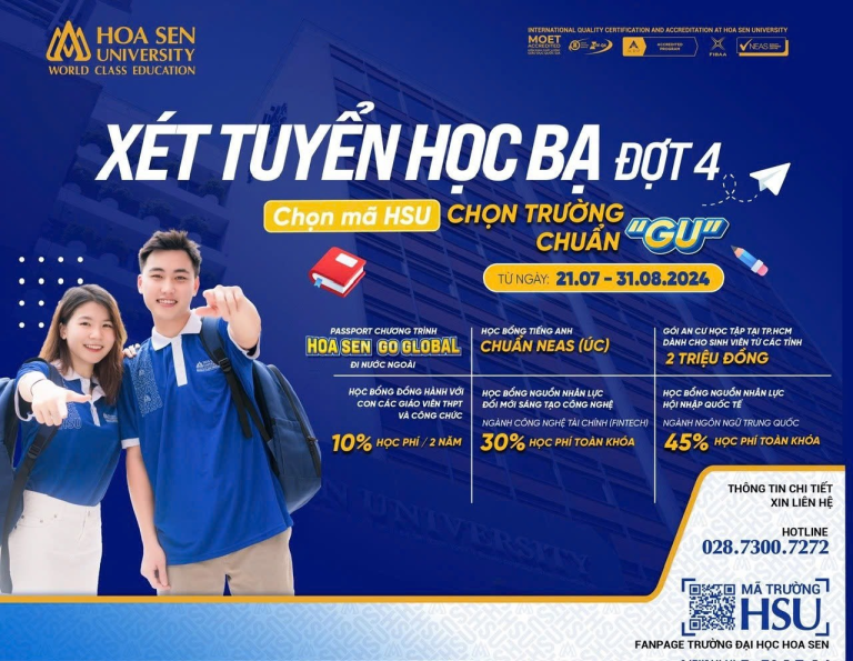 Kể từ hôm nay cho đến hết ngày 27/08/2024, HSU chào đón các bạn thí sinh đến trường hoàn tất thủ tục, nhận nhiều đặc quyền hấp dẫn. Bên cạnh phương thức xét tuyển bằng điểm thi tốt nghiệp THPT, Nhà Sen vẫn nhận xét tuyển bằng kết quả Học bạ nên các bạn đừng lo lắng nhé. Hướng dẫn hồ sơ nhập học: https://www.hoasen.edu.vn/tuyen…/huong-dan-ho-so-nhap-hoc/. Thời gian làm việc của trường từ 08h00 – 20h00, từ thứ Hai đến Chủ nhật kể cả ngày Lễ, tại Phòng 204 – Cơ sở Nguyễn Văn Tráng, Q.1. Mọi thắc mắc các bạn...