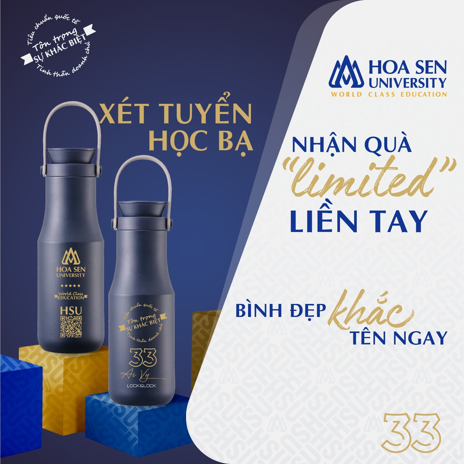 Chỉ trong tháng 6 này, nhân dịp kỷ niệm 33 năm thành lập Trường ĐH Hoa Sen, 335 BÌNH NƯỚC “LIMITED” KHẮC TÊN RIÊNG sẽ dành tặng cho các bạn thí sinh 2k6 khi đăng ký xét tuyển và nhập học trong 33 ngành “hot” của HSU.