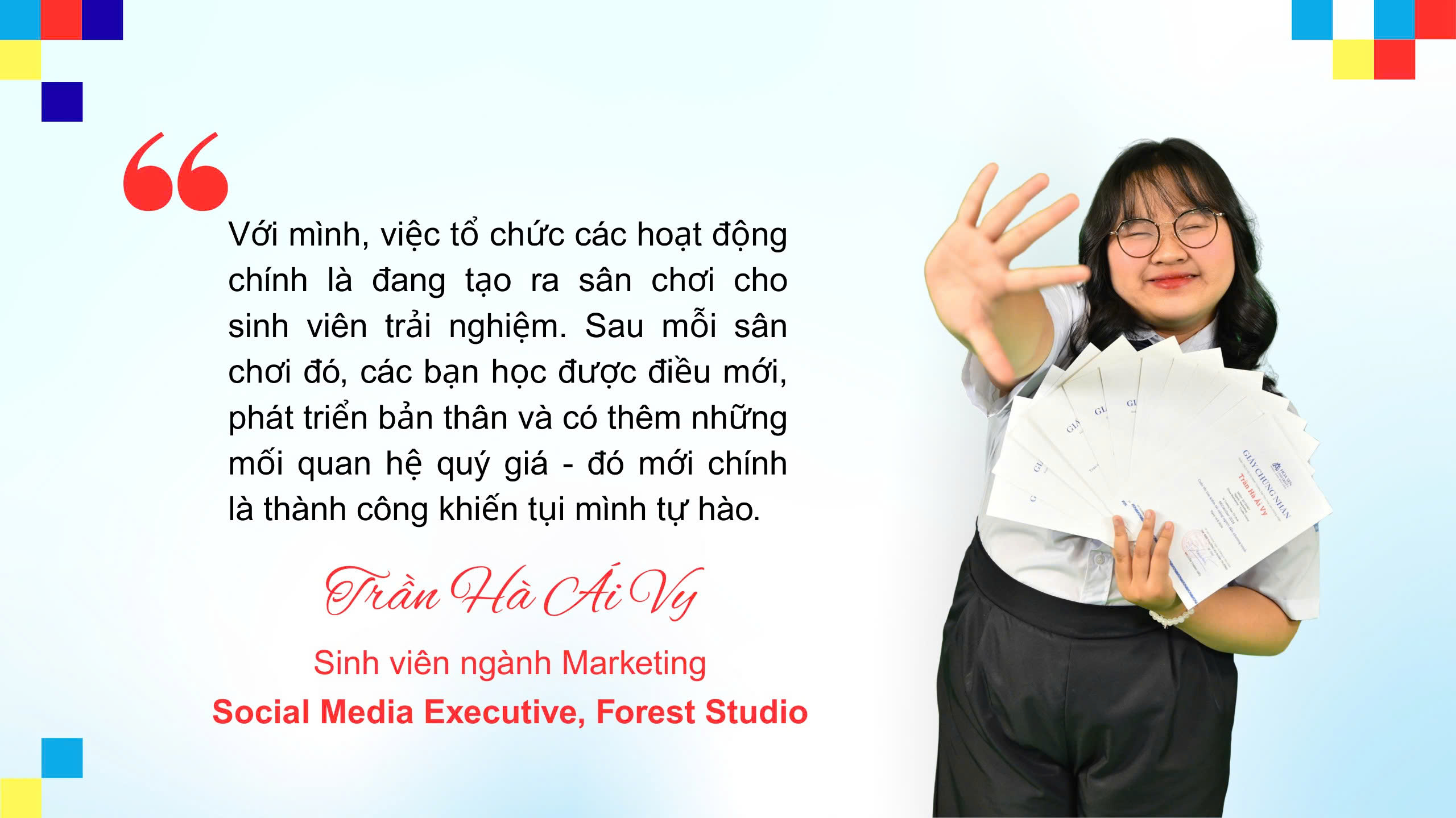 Nhưng trên hết, với Ái Vy, thành công không đo bằng giải thưởng hay “hào quang” cá nhân mà là những giá trị còn ở lại và được trao đi sau mỗi sự kiện. “Với mình, việc tổ chức các hoạt động chính là đang tạo ra sân chơi cho sinh viên trải nghiệm. Sau mỗi sân chơi đó, các bạn học được điều mới, phát triển bản thân và có thêm những mối quan hệ quý giá – đó mới chính là thành công khiến tụi mình tự hào” – Cô giãi bày.