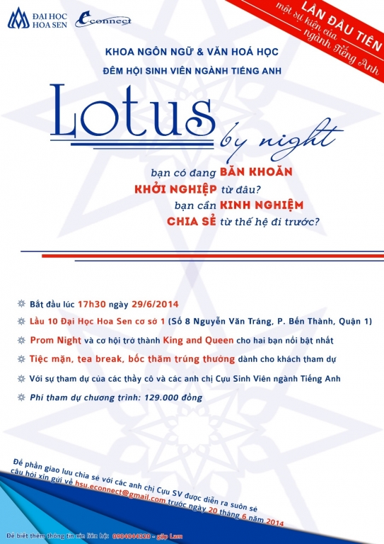 Vào ngày 29/6, Ngành Ngôn ngữ Anh – Khoa Ngôn ngữ và Văn hóa học giới thiệu chương trình “Lotus by night 2014” với chủ đề: Sinh viên ngành tiếng Anh: Kết nối ngành nghề, cạnh tranh quốc tế (E-Connect). Theo đó, đây là dịp để các thế hệ sinh viên đang theo học ngành Ngôn ngữ Anh tại các trường đại học, cao đẳng có cơ hội giao lưu với các doanh nghiệp và cựu sinh viên từng học ngành này hiện đang đi làm tại các công ty khác nhau. Từ đó, giúp sinh viên đang theo học hoặc quan tâm ngành Ngôn ngữ Anh hiểu rõ hơn các công việc sau khi tốt nghiệp và có định hướng rõ ràng hơn về nghề nghiệp tương lai, đồng thời nắm bắt được các cơ hội nghề nghiệp – phát triển sự nghiệp trong lĩnh vực này.