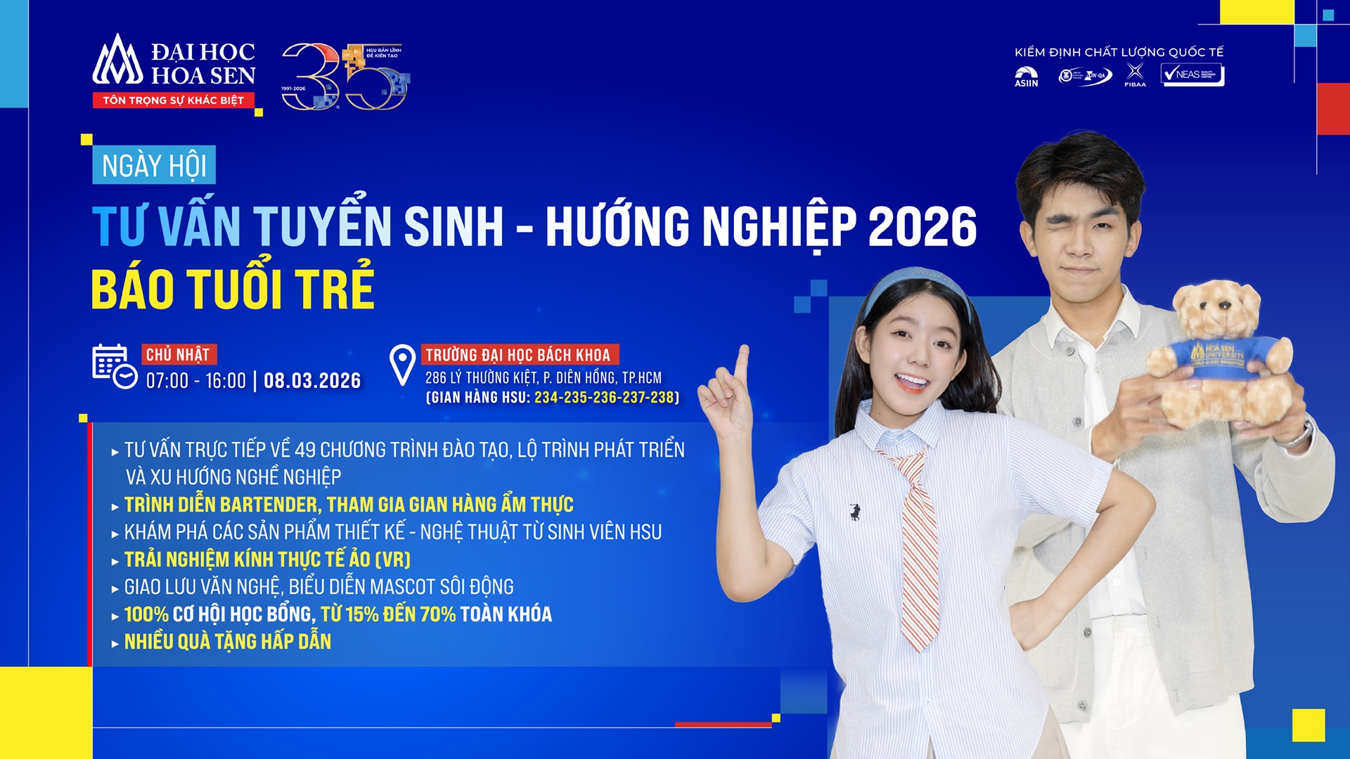 Phụ huynh và học sinh quan tâm có thể đến trực tiếp gian hàng 234 – 235 – 236 – 237 – 238 của Đại học Hoa Sen để được tư vấn chi tiết trong suốt thời gian diễn ra sự kiện.