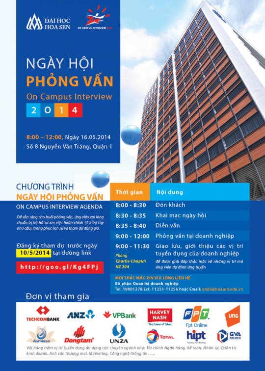 Từ 8:00 – 12:00 ngày 16/5, tại tầng trệt (G) của Trường Đại học Hoa Sen (Số 8, Nguyễn Văn Tráng, Q.1, TP.HCM) sẽ diễn ra Ngày hội Phỏng vấn 2014 (On Campus Interview 2014) do Phòng Hỗ trợ sinh viên tổ chức. Ngày hội dự kiến sẽ thu hút sự tham gia của 12 doanh nghiệp lớn tham dự: Ngân hàng Techcombank, Ngân hàng ANZ, ngân hàng VP Bank, Công ty Harvey Nash, Công ty FPT Online, Công ty VNG, Công ty ALSIMEXCO, Công ty Gạch Đồng Tâm, Công ty Wipro Unza Vietnam, Tập đoàn Total Việt Nam, công ty Global Vietnam Aluminium