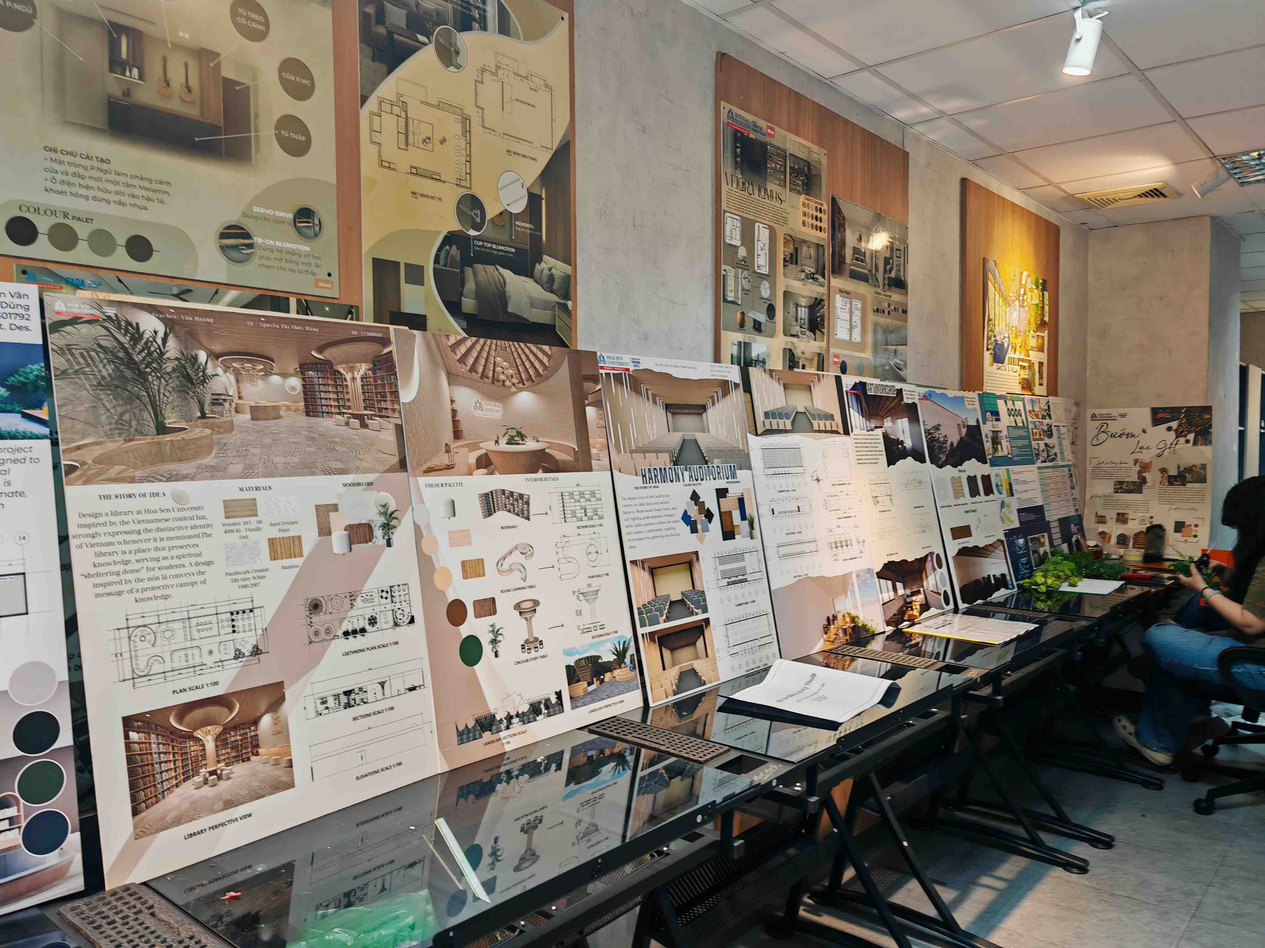 Trong không khí học kỳ cuối năm, không gian các studio và hành lang trưng bày của ngành Thiết kế nội thất – Đại học Hoa Sen (HSU) lại trở nên nhộn nhịp hơn bao giờ hết. Những tấm poster đồ án phủ kín tường, mô hình được đặt ngay ngắn trên bàn, sinh viên phấn khởi nhưng cũng hồi hộp đứng cạnh bài làm của mình, sẵn sàng trình bày và phản biện. Đó là hình ảnh quen thuộc nhưng luôn mang nhiều cảm xúc trong mỗi mùa chấm đồ án môn học.