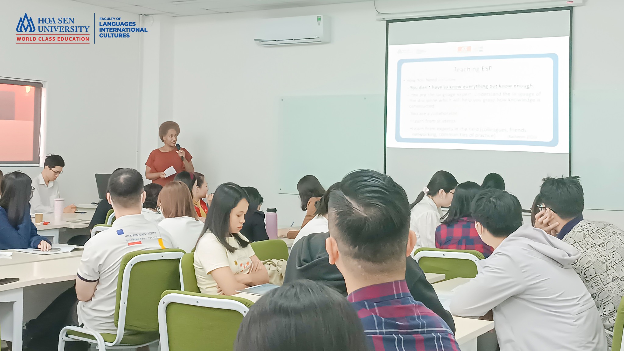Tại workshop, cô ??????? ???????? – ??????? ???????? ?????? từ RELO đã chia sẻ về việc dạy học tiếng Anh kinh doanh. Cụ thể là việc lựa chọn tài liệu, tổ chức hoạt động và cách đánh giá phù hợp cho lớp học tiếng Anh chuyên ngành (ESP), nhằm giúp người học mở rộng từ vựng, phát triển kỹ năng ngôn ngữ và giao tiếp hiệu quả trong lĩnh vực kinh doanh và khởi nghiệp. Các thầy cô và các bạn sinh viên đã có buổi thảo luận sôi nổi cũng như tham gia trải nghiệm hoạt động dạy học giúp người học vận dụng tiếng Anh để xử lý tình huống trong hoạt động kinh doanh.
