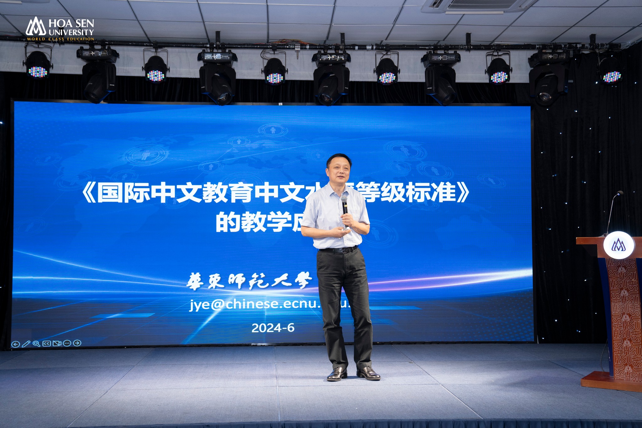 Ở tham luận đầu tiên, Giáo sư Ye Jun (叶军) – Phó viện trưởng Học viện Văn hóa Hán ngữ Quốc Tế, Đại học Sư phạm Hoa Đông, Thượng Hải, Trung Quốc, Phó chủ nhiệm Trung tâm nghiên cứu phát triển Tiếng Trung toàn cầu thuộc Ủy ban ngôn ngữ quốc gia đã mang đến chủ đề thiết thực: Ứng dụng “Tiêu chuẩn trình độ tiếng Trung trong Giáo dục Tiếng Trung quốc tế” vào giảng dạy. Giáo sư đã có những chia sẻ về tiêu chuẩn giảng dạy tiếng Trung quốc tế và cũng đưa ra kinh nghiệm để ứng dụng vào giảng dạy tại Việt Nam.