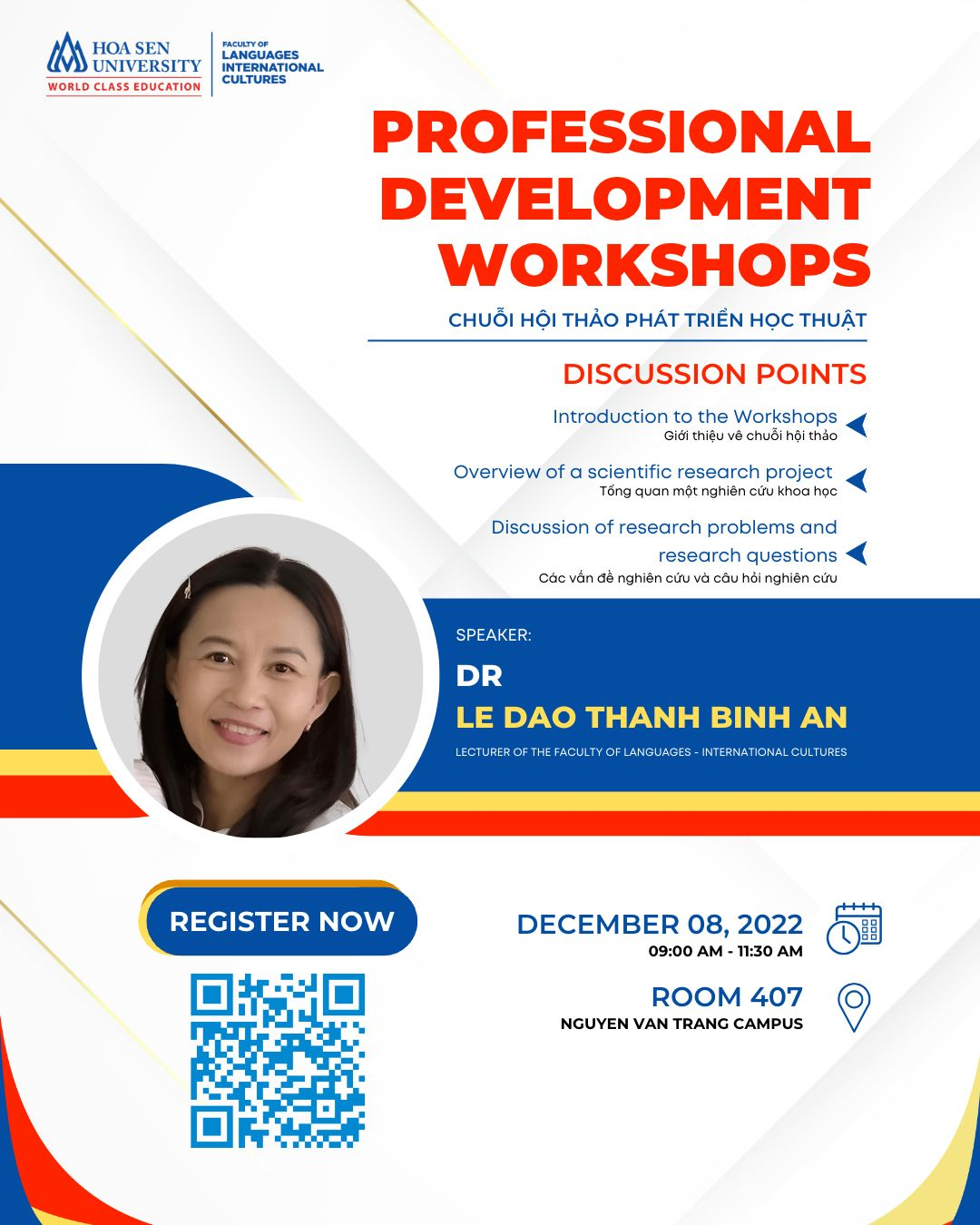 Nhằm giúp Giảng Viên (GV) nâng cao khả năng nghiên cứu khoa học, tạo diễn đàn cho GV trao đổi học thuật, buổi sáng ngày 08/12, Tiến Sĩ Lê Đào Thanh Bình An chính thức tổ chức Chuỗi Hội Thảo Phát Triển Học Thuật – Professional Development Workshops.