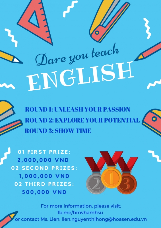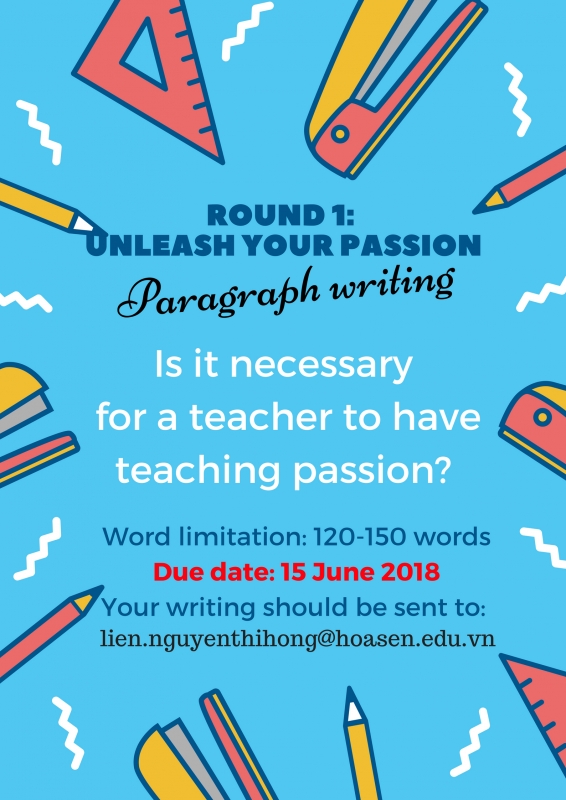 DARE YOU TEACH ENGLISH Have you ever portrayed yourself as a teacher? Are you passionate about teaching? Dare you teach English, a contest organized by the Faculty of Social Sciences and Humanities, is now open to all current undergraduates of Hoa Sen University. This contest aims to provide an opportunity for all HSU students to explore and develop their potential talent for teaching English as well as create a playground for all HSU students to share their teaching ideas and learn from each other. FIRST ROUND: UNLEASH YOUR PASSION Write a short paragraph on the following topic: Is it necessary for a teacher to have teaching passion? GUIDELINES:
