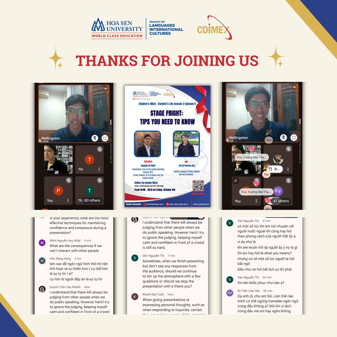 Ngày 06.10.2023 vừa qua, Khoa Ngôn ngữ – Văn hoá Quốc tế đã tổ chức buổi thứ 8 của chuỗi webinar [Student’s Mind – Student’s Life] với chủ đề [STAGE FRIGHT: TIPS YOU NEED TO KNOW], với sự tham gia của diễn giả Nguyễn Vũ Chinh và MC Vũ Thị Phương Anh.