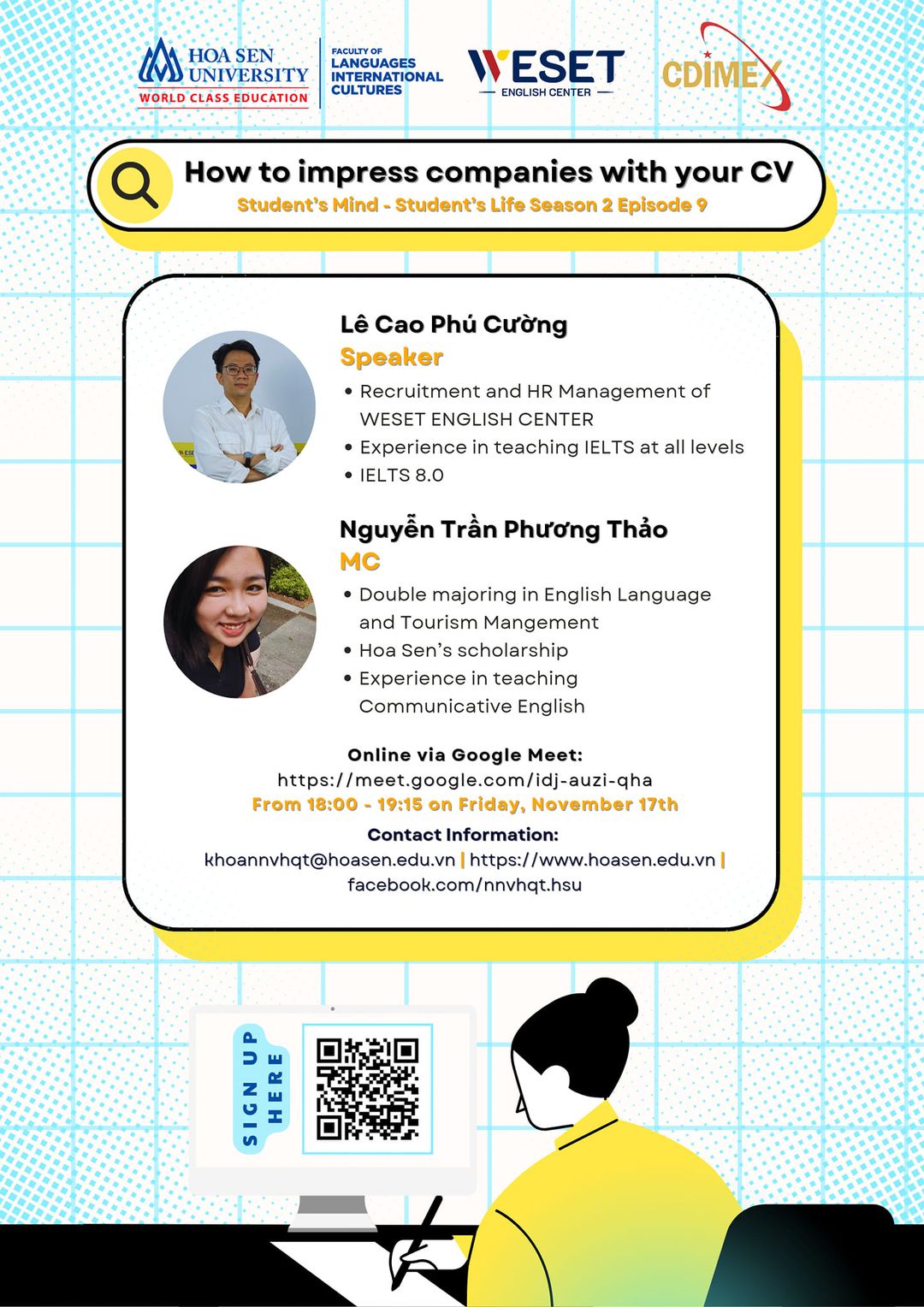 Ngày 17.11.2023, Khoa Ngôn ngữ – Văn hoá Quốc tế sẽ tổ chức tập thứ 9 của chuỗi Webinar [Student’s Mind – Student’s Life] với chủ đề How To Impress Companies With Your CV