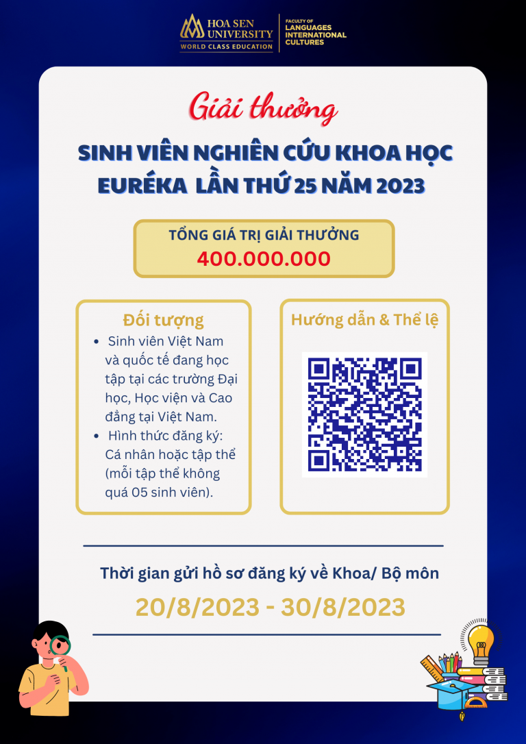 Duy trì sân chơi học thuật truyền thống, phát huy năng lực sáng tạo, chủ động trong học tập, nghiên cứu của sinh viên Thành phố Hồ Chí Minh nói chung và của Đại học Hoa Sen nói riêng, Phòng Quản lý khoa học – Tạp chí Khoa học thông báo cuộc thi “Giải thưởng Sinh viên Nghiên cứu khoa học – Eureka, lần thứ 25 năm 2023” do Thành đoàn TP.HCM tổ chức.