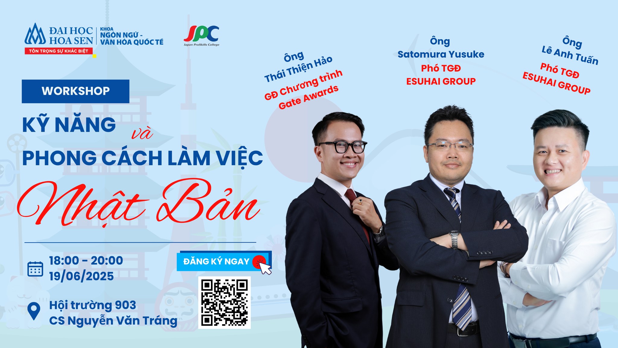 Bạn đang tìm kiếm cơ hội làm việc tại các doanh nghiệp Nhật Bản? Làm sao để ghi điểm với nhà tuyển dụng Nhật Bản bằng tác phong “chuẩn Nhật”? Vậy thì đừng bỏ lỡ Workshop “Kỹ năng và phong cách làm việc Nhật Bản”, do Khoa Ngôn ngữ – Văn hóa Quốc tế phối hợp cùng Trường Trung cấp Kỹ năng chuyên nghiệp Nhật Bản JPC tổ chức nhé! Đến với workshop, bạn sẽ được lắng nghe những chia sẻ quý báu từ các chuyên gia có kinh nghiệm sâu rộng trong lĩnh vực đào tạo và phát triển...