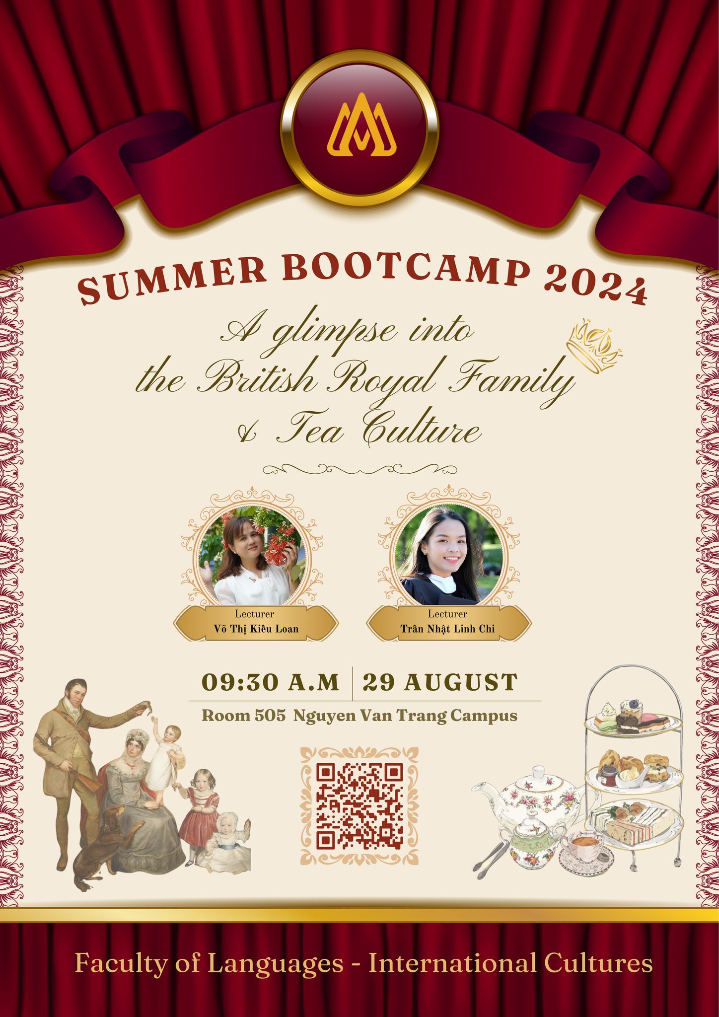Hành trình trải nghiệm văn hóa của Summer Boot Camp 2024 sẽ tiếp tục bước vào chặng đường mới mẻ và độc đáo ở Session 3: “A Glimpse into the British Royal Family and Tea Culture”. Hoàng gia Anh là một trong những hoàng tộc lâu đời nhất trên thế giới, với lịch sử kéo dài hơn 1.000 năm. Khởi đầu từ thời kỳ của vua Alfred Đại đế vào thế kỷ thứ 9, hoàng tộc này đã trải qua nhiều giai đoạn thăng trầm và hiện vẫn tiếp tục trị vì nước Anh. Hoàng gia Anh không chỉ góp...