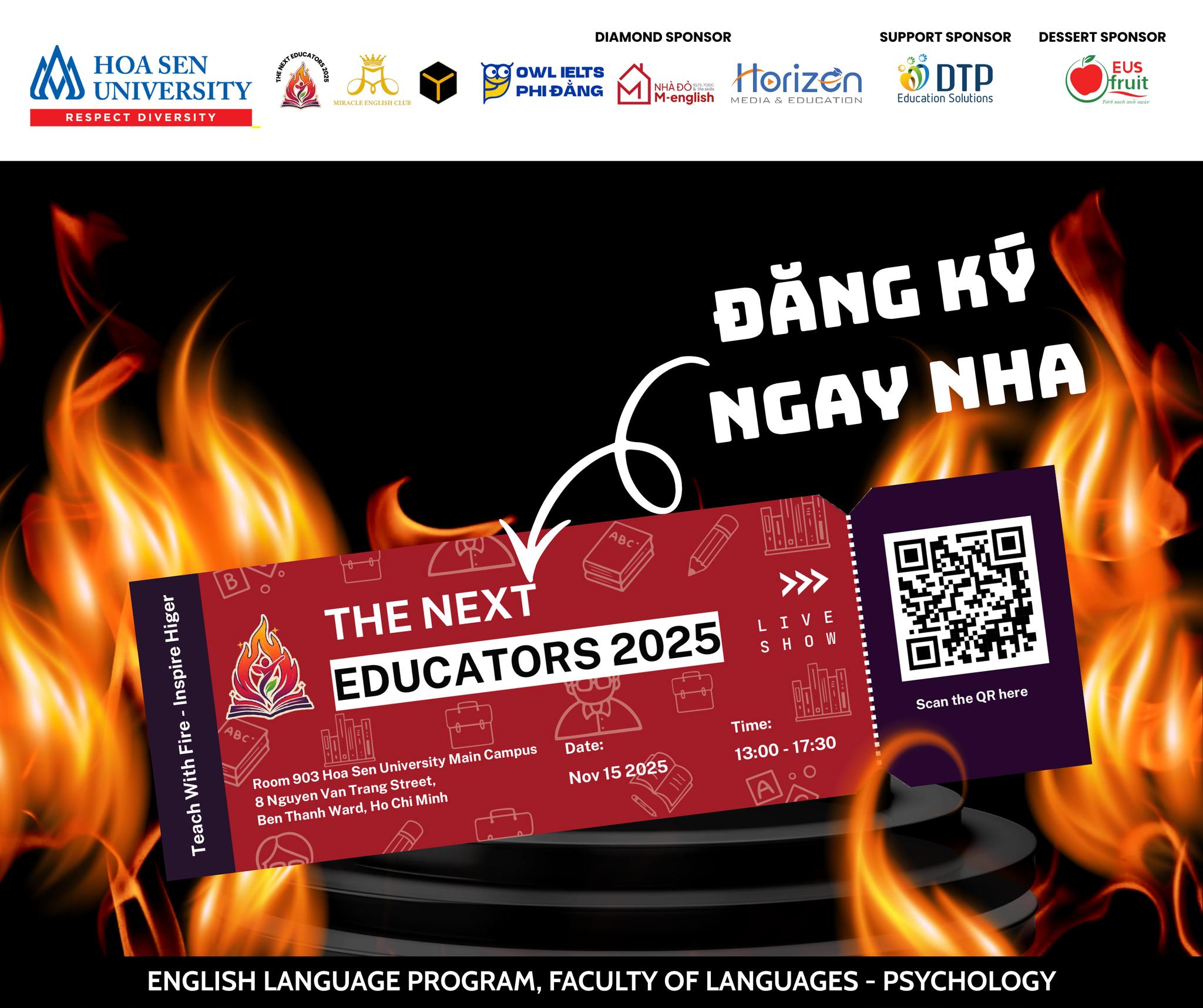 Bạn có đam mê giảng dạy và mong muốn thử sức với vai trò người truyền cảm hứng tiếng Anh? Đây chính là cơ hội để bạn tỏa sáng cùng Cuộc thi The Next Educators 2025!! The Next Educators 2025 là cuộc thi giảng dạy tiếng Anh do ngành Ngôn ngữ Anh, thuộc Khoa Ngôn ngữ – Tâm lý, Trường Đại học Hoa Sen tổ chức. Đây hứa hẹn sẽ là nơi bạn không thể bỏ lỡ vì: Cơ hội thử thách và phát triển kỹ năng giảng dạy trong một môi trường thực tế. Cơ hội phát triển thông...