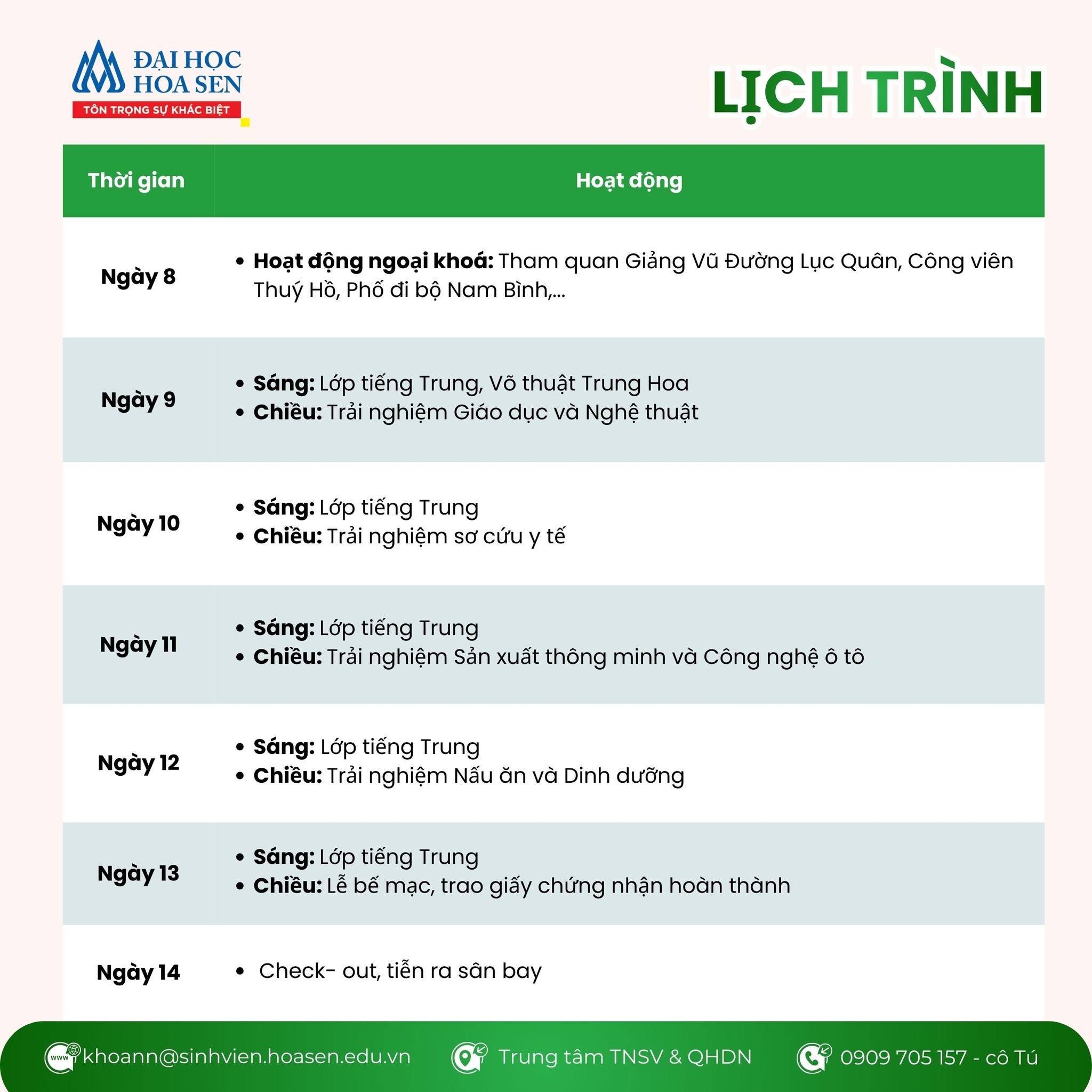 *Chi phí trên đã bao gồm: vé máy bay, phí visa, ăn uống, lưu trú, học tập, di chuyển, tham quan và bảo hiểm suốt chuyến đi theo lịch trình.