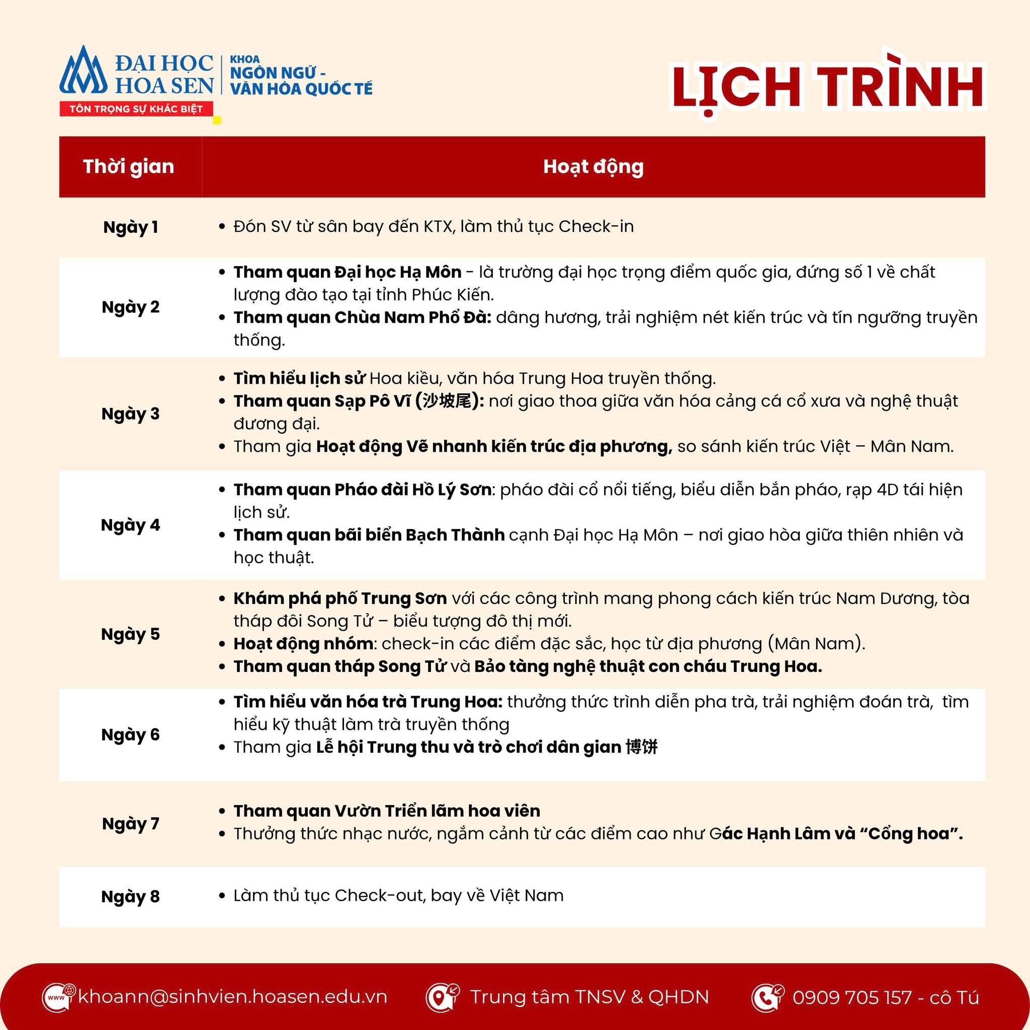 Khoa Ngôn ngữ – Văn hoá Quốc tế thông báo về chương trình học tập và trải nghiệm văn hoá tại thành phố Hạ Môn (Trung Quốc) dành cho sinh viên Trường Đại học Hoa Sen năm 2025. Đây là hoạt động ngoại khóa kết hợp học thuật – văn hóa – du lịch quốc tế mang lại nhiều giá trị thiết thực cho người học.