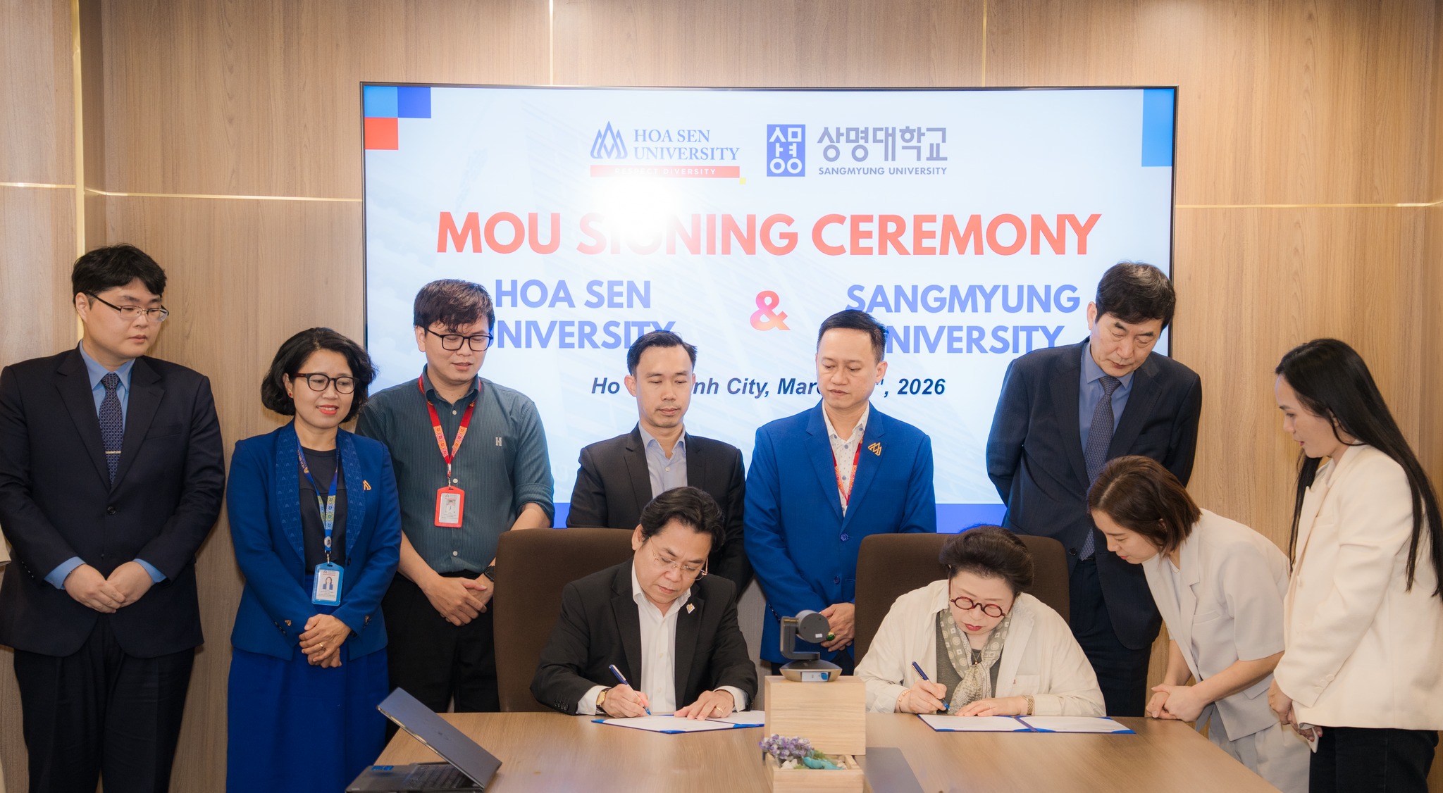 Chiều 18/3/2026, Trường Đại học Hoa Sen đã tổ chức lễ ký kết Biên bản ghi nhớ hợp tác (MOU) với Trường Đại học Sangmyung (Hàn Quốc) tại trụ sở Nguyễn Văn Tráng. Sự kiện này đánh dấu thêm một bước tiến quan trọng trong hành trình quốc tế hóa giáo dục của HSU, đặc biệt trong lĩnh vực đào tạo ngành Ngôn ngữ Hàn Quốc.