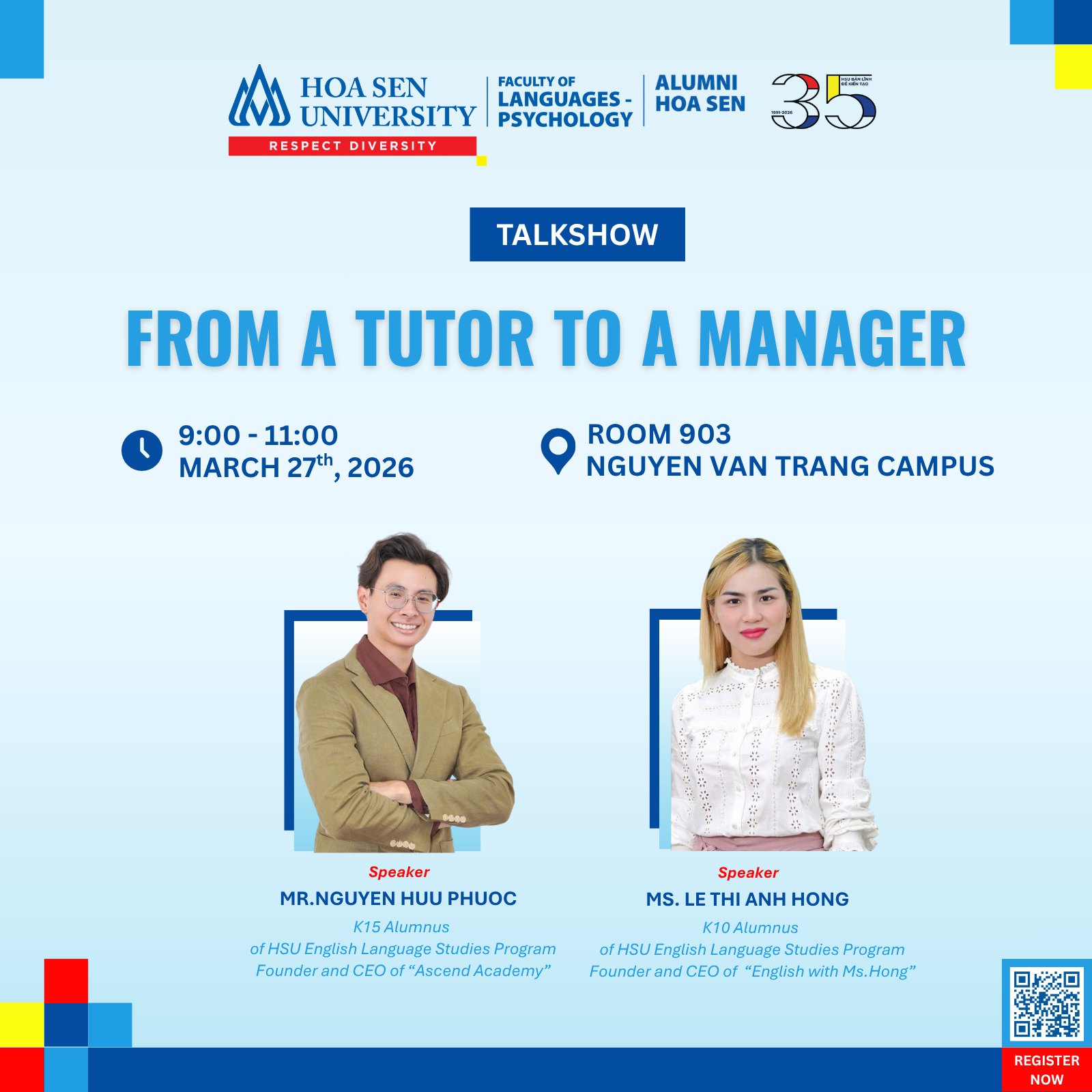 Chiều 18/3/2026, Trường Đại học Hoa Sen đã tổ chức lễ ký kết Biên bản ghi nhớ hợp tác (MOU) với Trường Đại học Sangmyung (Hàn Quốc) tại trụ sở Nguyễn Văn Tráng. Sự kiện này đánh dấu thêm một bước tiến quan trọng trong hành trình quốc tế hóa giáo dục của HSU, đặc biệt trong lĩnh vực đào tạo ngành Ngôn ngữ Hàn Quốc.