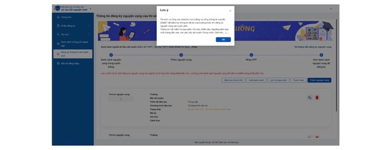 Nhấn vào nút OK để vào màn hình Thông tin đăng ký nguyện vọng của thí sinh