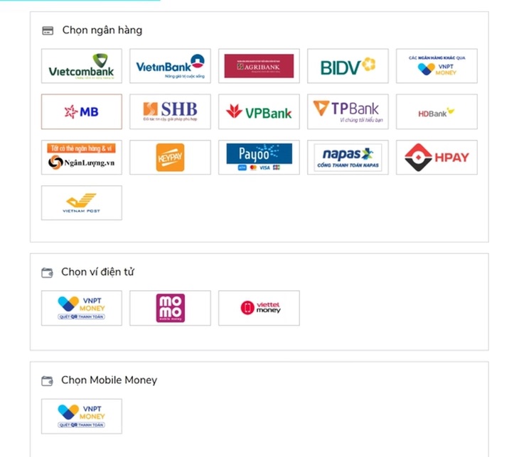 - Các ví điện tử: VNPT Money, Momo, Viettel Money.