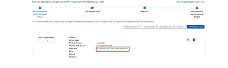 Khi nguyện vọng hiển thị trạng thái Đã ghi nhận NV – NV đã được thanh toán là quy trình đã hoàn thành (nếu trạng thái nguyện vọng chưa được ghi nhận, nhấn Ctrl + F5 để Refresh màn hình).