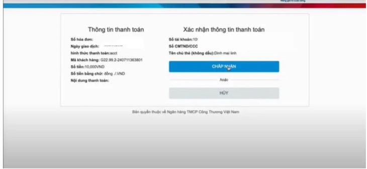 Bước 6: Nhập Thông tin tài khoản thanh toán như số thẻ ngân hàng hoặc thông tin ví điện tử rồi nhấn vào nút Chấp nhận phía dưới để thực hiện nộp lệ phí.