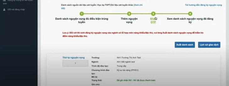 Sau khi đăng nhập hệ thống, thí sinh truy cập menu Đăng ký thông tin xét tuyển sinh. Tại màn hình 4. Xem danh sách nguyện vọng đã đăng ký, thí sinh nhấn nút Thanh toán.