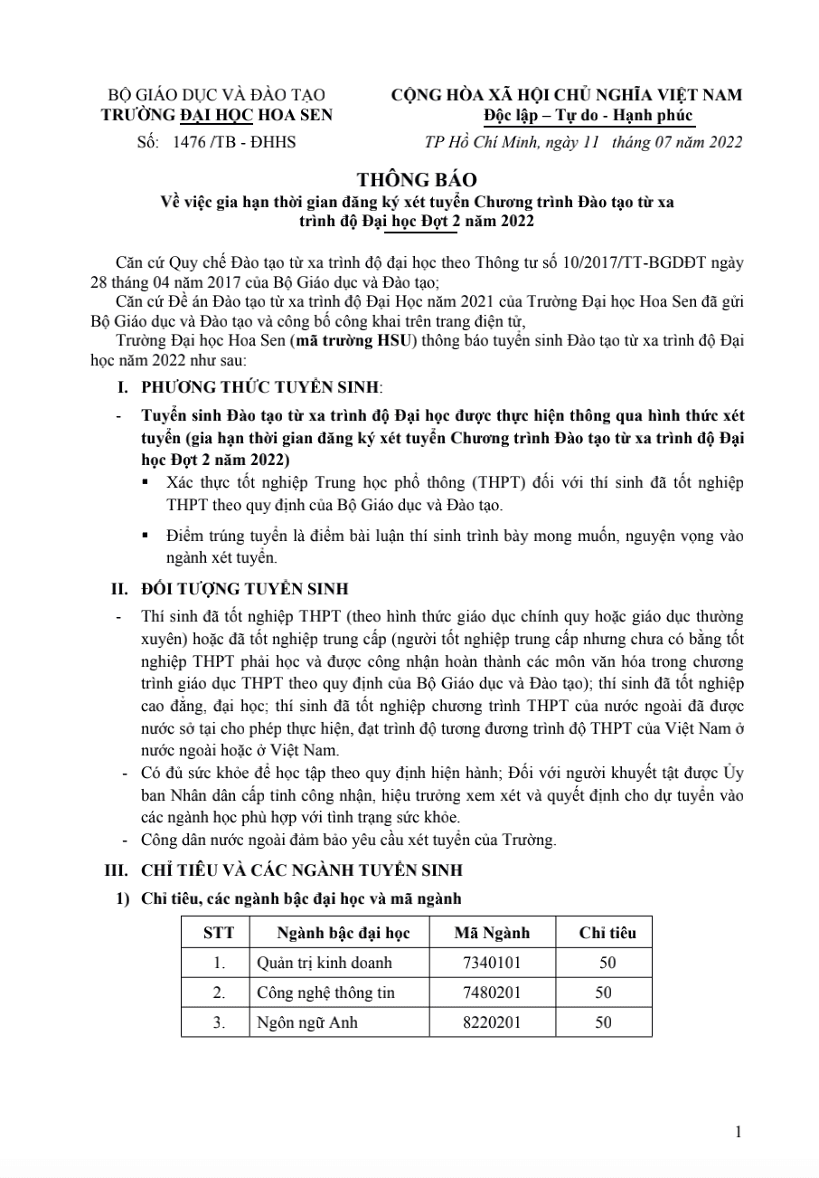 Trang chủ - Tuyển Sinh - Thông báo về việc gia hạn thời gian đăng ký xét tuyển Chương trình Đào tạo trực tuyến trình độ Đại học Đợt 2 năm 2022
