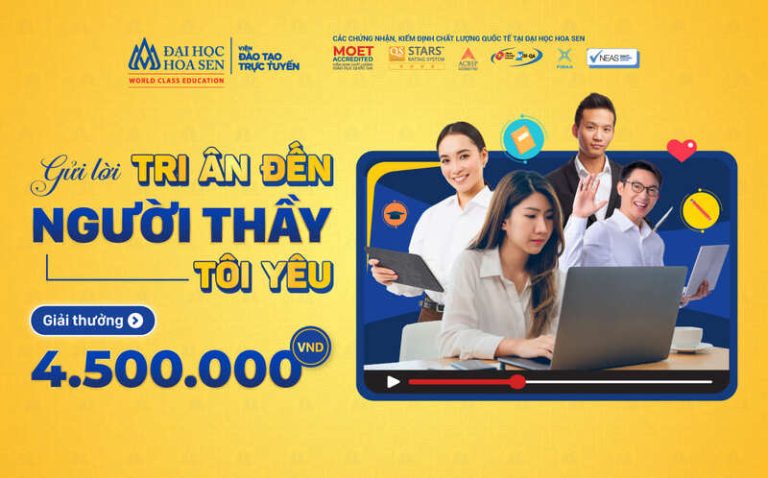 I. TỔNG QUÁT VỀ CUỘC THI VIDEO “GỬI LỜI TRI ÂN ĐẾN NGƯỜI THẦY TÔI YÊU”. Chương trình được tổ chức cuộc thi VIDEO “GỬI LỜI TRI ÂN ĐẾN NGƯỜI THẦY TÔI YÊU” nhân ngày Nhà Giáo Việt Nam 20/11. Đối tượng tham gia: Tất cả sinh viên các ngành, đang học Đại học trực tuyến tại trường Đại học Hoa Sen. Thời gian thực hiện: Cuộc thi diễn ra từ ngày 15 tháng 11 năm 2023 đến hết ngày 19 tháng 11 năm 2023 tại Fanpage “Viện Đào Tạo Trực Tuyến – trường Đại học Hoa Sen”. II. THỂ...