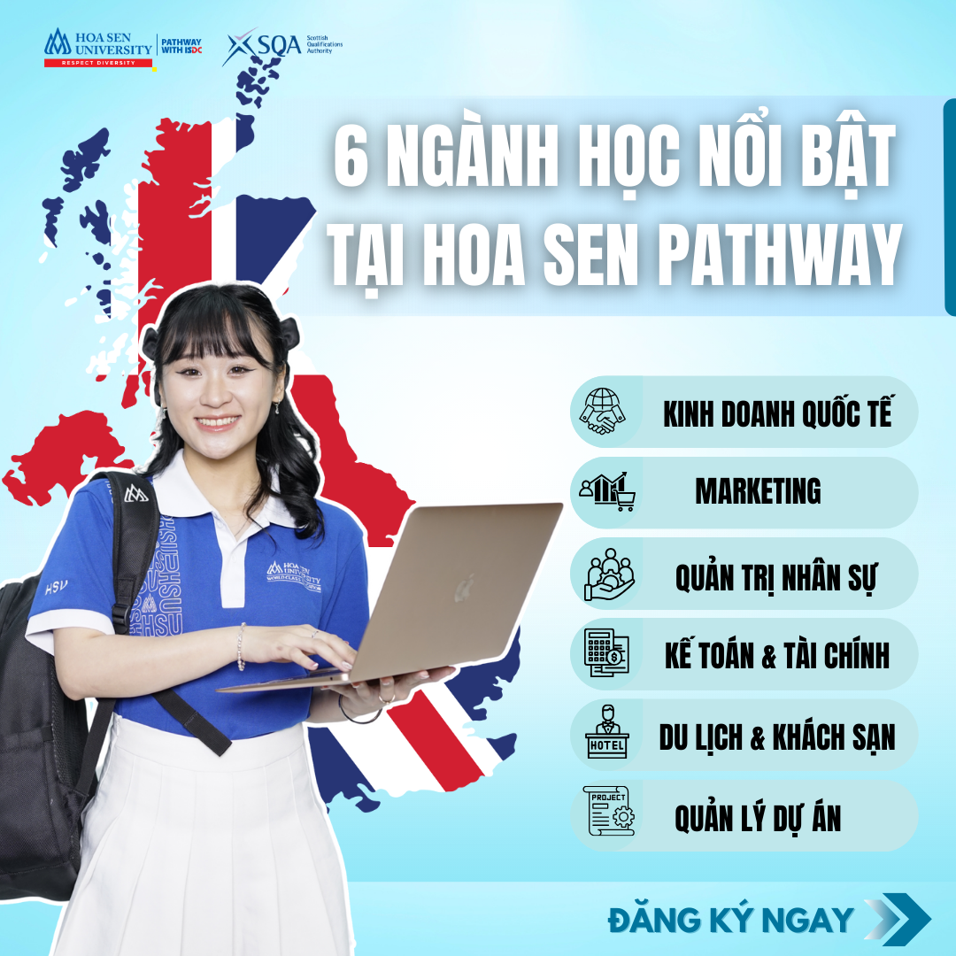 Bạn đang phân vân chưa biết nên chọn ngành nào để vừa phù hợp với đam mê, vừa mở ra sự nghiệp quốc tế? Đừng lo! Hoa Sen Pathway 2+2 mang đến cho bạn 6 nhóm ngành “hot” nhất hiện nay, giúp bạn thoải mái lựa chọn và tự tin chinh phục tấm bằng cử nhân danh giá từ Anh Quốc.