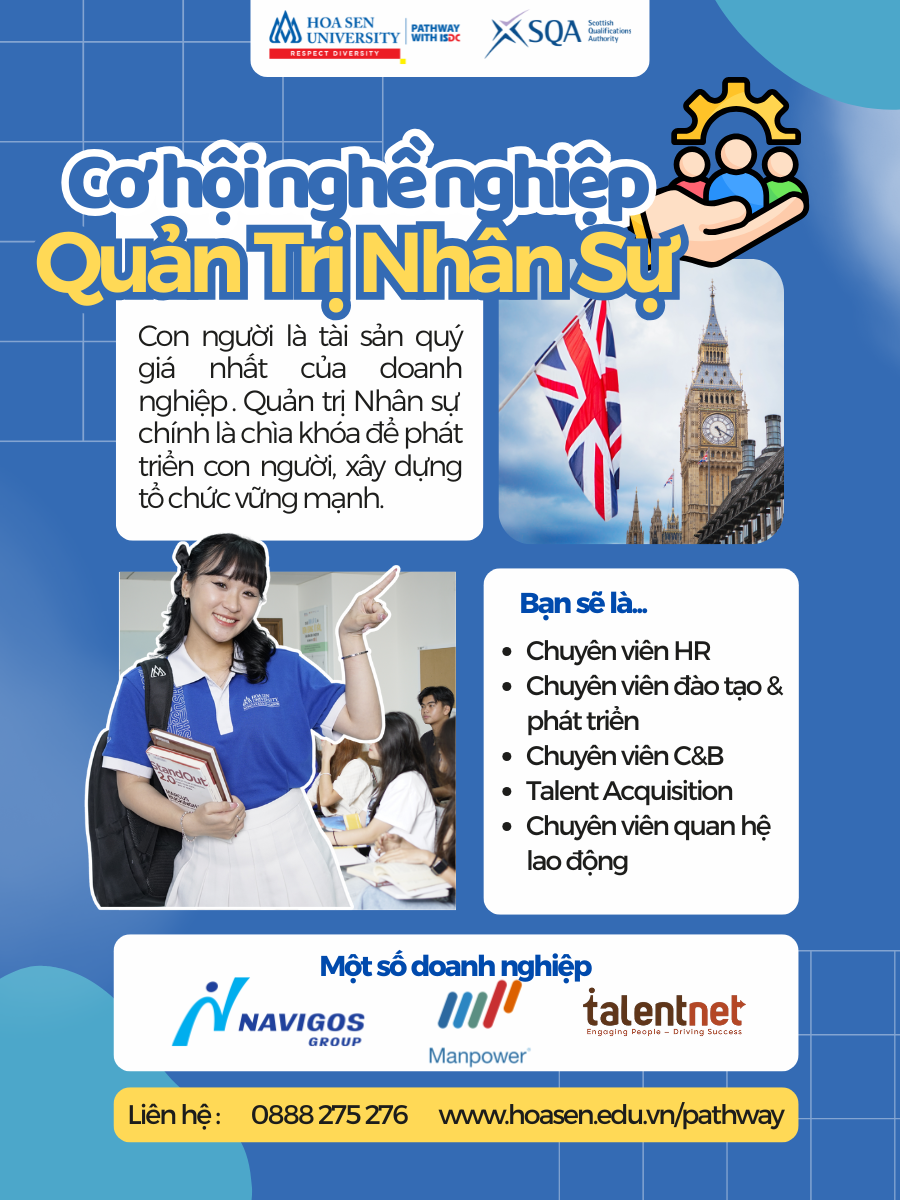 Trong thời đại mà con người được xem là tài sản quý giá nhất của doanh nghiệp, ngành Quản trị Nhân sự (Human Resource Management – HRM) ngày càng khẳng định vai trò chiến lược trong mọi tổ chức. Tại Đại học Hoa Sen (HSU), chương trình Hoa Sen Pathway 2+2 liên kết với các trường đại học Anh Quốc uy tín mang đến cho sinh viên cơ hội học tập và phát triển chuyên sâu về ngành Quản trị Nhân sự theo chuẩn quốc tế, chỉ với đầu vào từ IELTS 4.0.