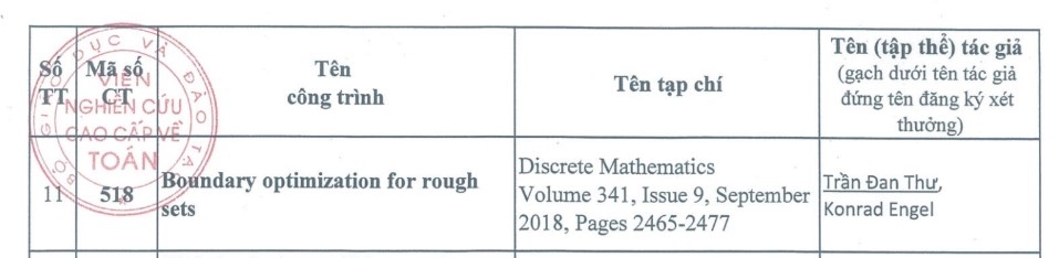 Danh sách các công trình Toán học được thưởng kèm theo quyết định này có công trình “Boundary optimization for rough sets” của hai tác giả Trần Đan Thư (Trường Đại học Hoa sen) và Konrad Engel (Giáo sư Đại học Rostock và Viện Toán học Đức, Đức) được công bố quốc tế trên tạp chí Discrete Mathematics tháng 9/2018.