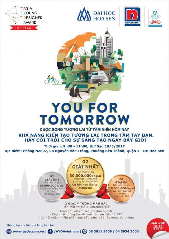 Đến với AYDA 2017, BTC cuộc thi đã xác định được một yếu tố quan trọng sẽ tạo nên sự khác biệt và trưởng thành cho thế hệ thiết kế trẻ. Yếu tố đó chính là tư duy hướng đến tương lai. Táo bạo là chưa đủ. Thân thiện với môi trường là chưa đủ. Tư duy hướng đến tương lai sẽ giúp bạn hình dung được những thay đổi trong lối sống và môi trường sống trong tương lai, đồng thời có khả năng triển khai thiết kế cho cuộc sống tương lai ngay từ bây giờ. Vì vậy, chủ đề cho AYDA 2017 BTC đưa ra là “You For Tomorrow” (Cuộc sống tương lai từ tầm nhìn ngày hôm nay). Tương lai được xây dựng từ tầm nhìn của ngày hôm nay, hãy để những công trình mà bạn đã, đang và sẽ thiết kế vượt qua được thử thách của thời gian. Vậy, bạn sẽ kiến tạo nên một tương lai như thế nào? Không gian nội thất trong tương lai sẽ là một nơi làm việc, sinh sống hay sinh hoạt cộng đồng?