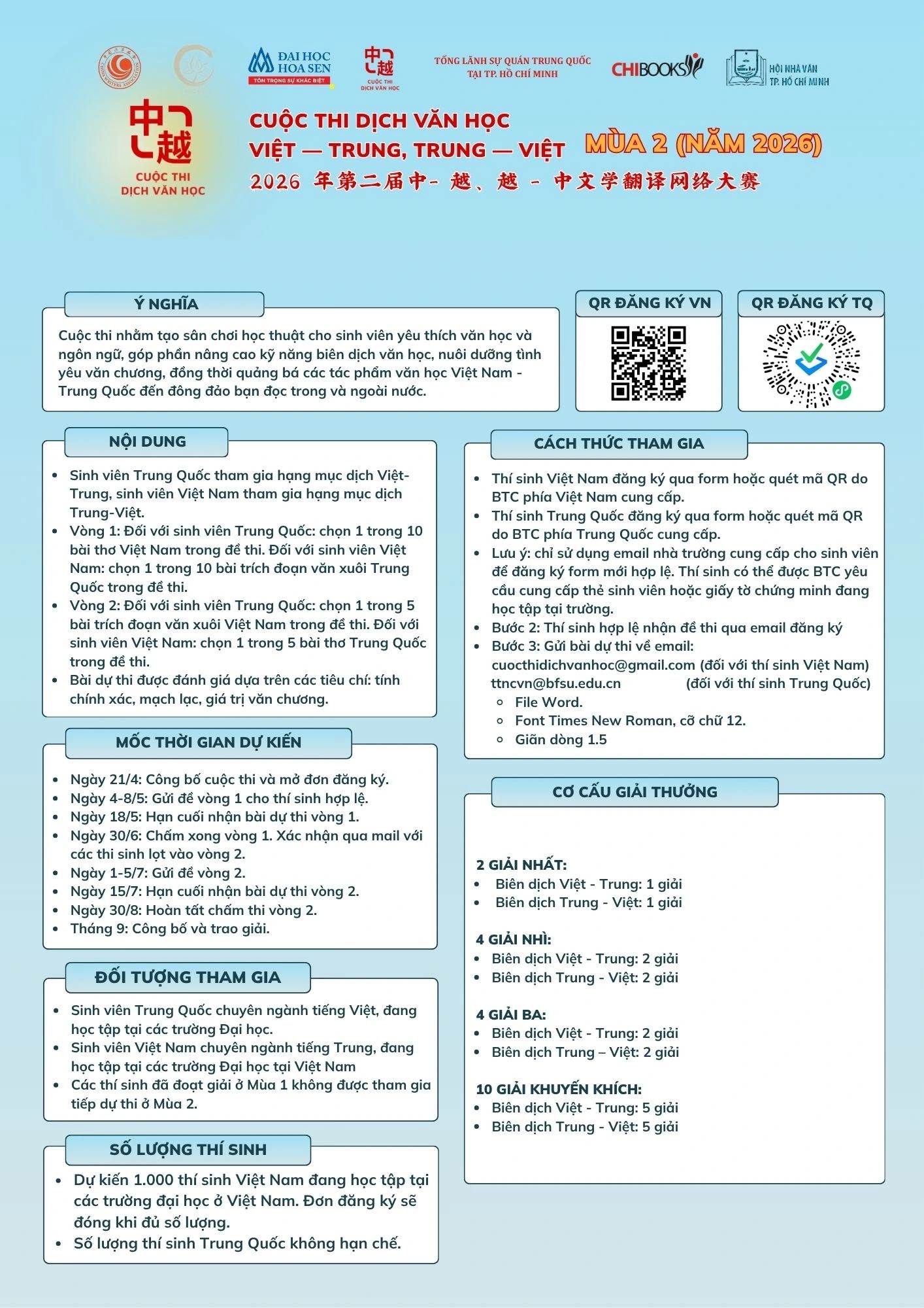Trong không khí hưởng ứng chuỗi sự kiện “Ngày Sách và Văn hóa đọc Việt Nam lần thứ 5 & Giao lưu văn chương Việt – Trung năm 2026”, cuộc thi dịch văn học Việt – Trung, Trung – Việt lần thứ 2 chính thức khởi động tại Đại học Hoa Sen (HSU). Hoạt động hướng đến việc kết nối tri thức, nuôi dưỡng tình yêu văn học và phát triển năng lực dịch thuật cho sinh viên.