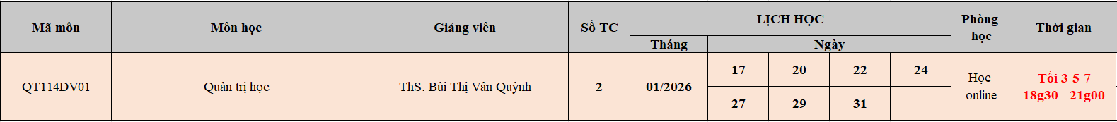 - Thời khóa biểu: 18h30 – 21h00 Tối Thứ 3-5-7 (từ 17/01/2026 – 31/01/2026)