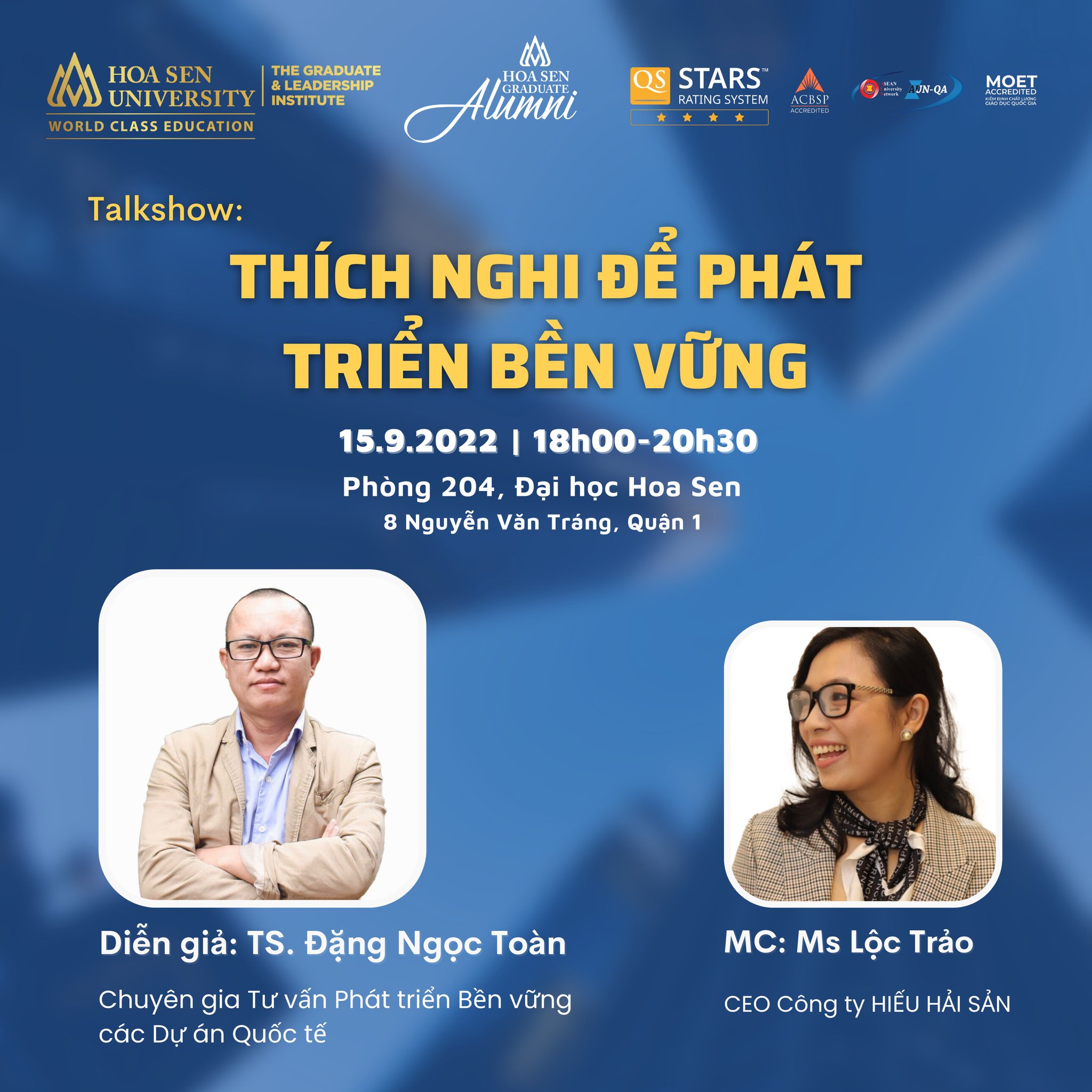 Chương trình hội thảo chuyên đề quản trị do Hoa Sen Graduate Alumni - HSGA số tháng 9 với chủ đề: "Thích nghi để phát triển bền vững" được tổ chức trực tiếp tại Trường Đại học Hoa Sen vào ngày 15/09/2022 với sự tham gia của Diễn giả: TS. Đặng Ngọc Toàn - Chuyên gia tư vấn phát triển bền vững các dự án quốc tế.