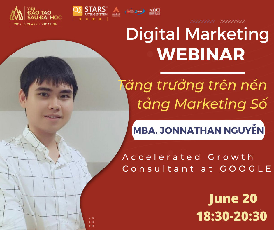 Webinar chuyên đề Digital Marketing: Tăng trưởng trên nền tảng Marketing Số, với sự tham gia của diễn giả Jonnathan Nguyễn - Accelerated Growth Consultant tại GOOGLE được tổ chức vào lúc 18H30 - 20H30 ngày 20/06/2022