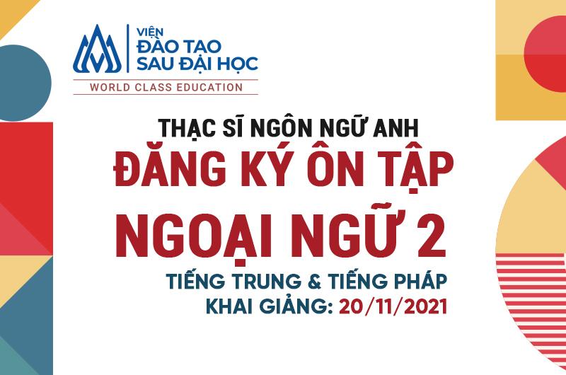 Để hỗ trợ thí sinh tham gia kỳ thi đánh giá năng lực Ngoại ngữ, Viện Đào tạo Sau Đại học mở các lớp ôn tập Ngoại ngữ 2 (Tiếng Trung và Tiếng Pháp) dành cho các thí sinh đăng ký dự tuyển chương trình Thạc sĩ Ngôn ngữ Anh (MAE). Thí sinh khi đăng ký dự tuyển chương trình Thạc sĩ Ngôn ngữ Anh phải tham gia kỳ thi đánh giá năng lực Ngoại ngữ do trường tổ chức (Tiếng Trung hoặc Tiếng Pháp) hoặc được xét miễn thi nếu đáp ứng yêu cầu về trình độ Ngoại ngữ. >> Thông báo Tuyển sinh Thạc sĩ đợt 2 Điều kiện xét miễn thi Ngoại ngữ...