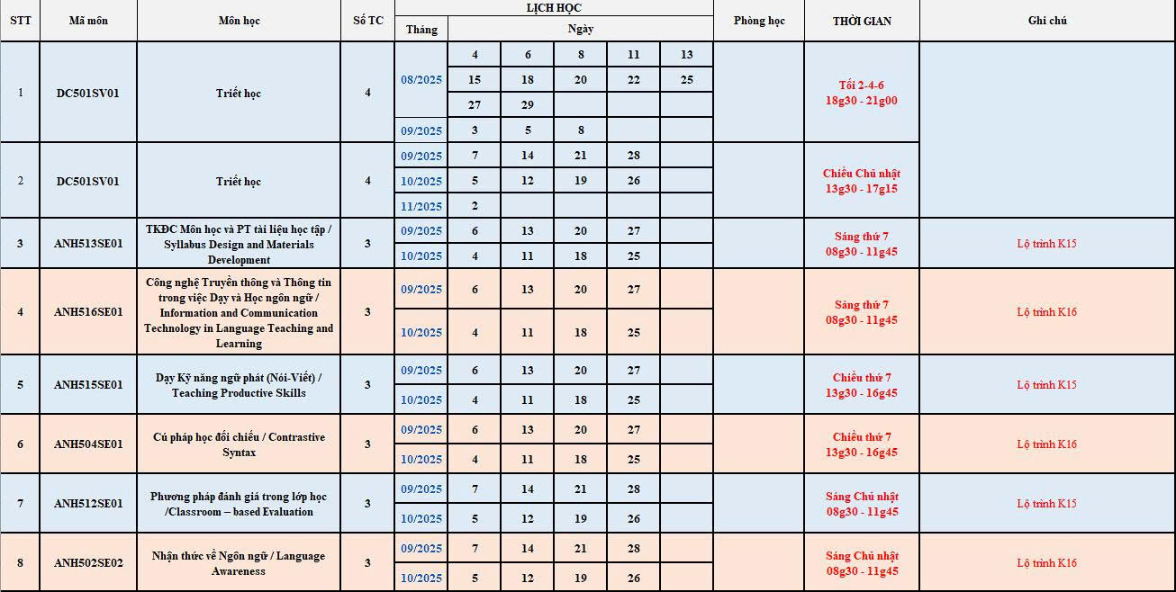 ĐH HOA SEN: THỜI KHÓA BIỂU CHƯƠNG TRÌNH THẠC SĨ NGÔN NGỮ ANH (MAE) – HỌC KỲ 2541
