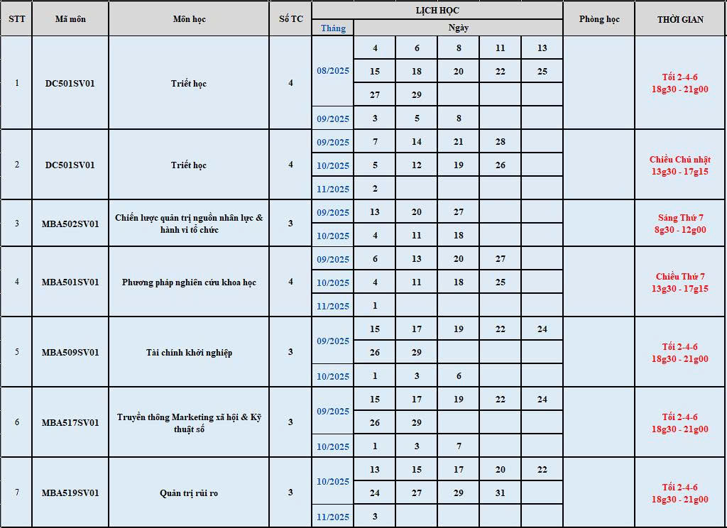 ĐH HOA SEN: THỜI KHÓA BIỂU CHƯƠNG TRÌNH THẠC SĨ QUẢN TRỊ KINH DOANH (MBA) – HỌC KỲ 2541