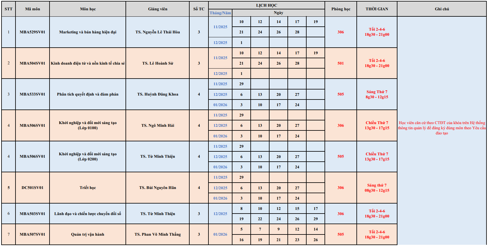 Học kỳ 2542 (từ tháng 11/2025 đến tháng 1/2026), Viện Sau Đại học & Lãnh đạo, Trường Đại học Hoa Sen tổ chức các học phần sau trong chương trình Thạc sĩ Quản trị Kinh doanh (MBA).