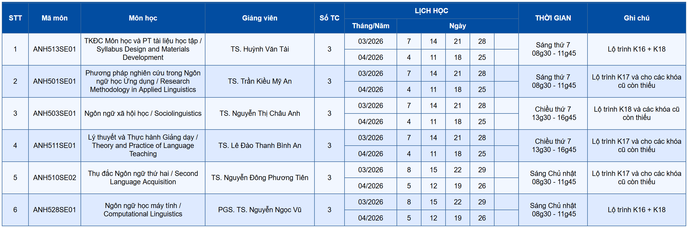 Học kỳ 2543 (từ tháng 02/2026 đến tháng 05/2026), Viện Sau Đại học & Lãnh đạo, Trường Đại học Hoa Sen tổ chức các học phần sau trong chương trình Thạc sĩ Ngôn ngữ Anh (MAE).