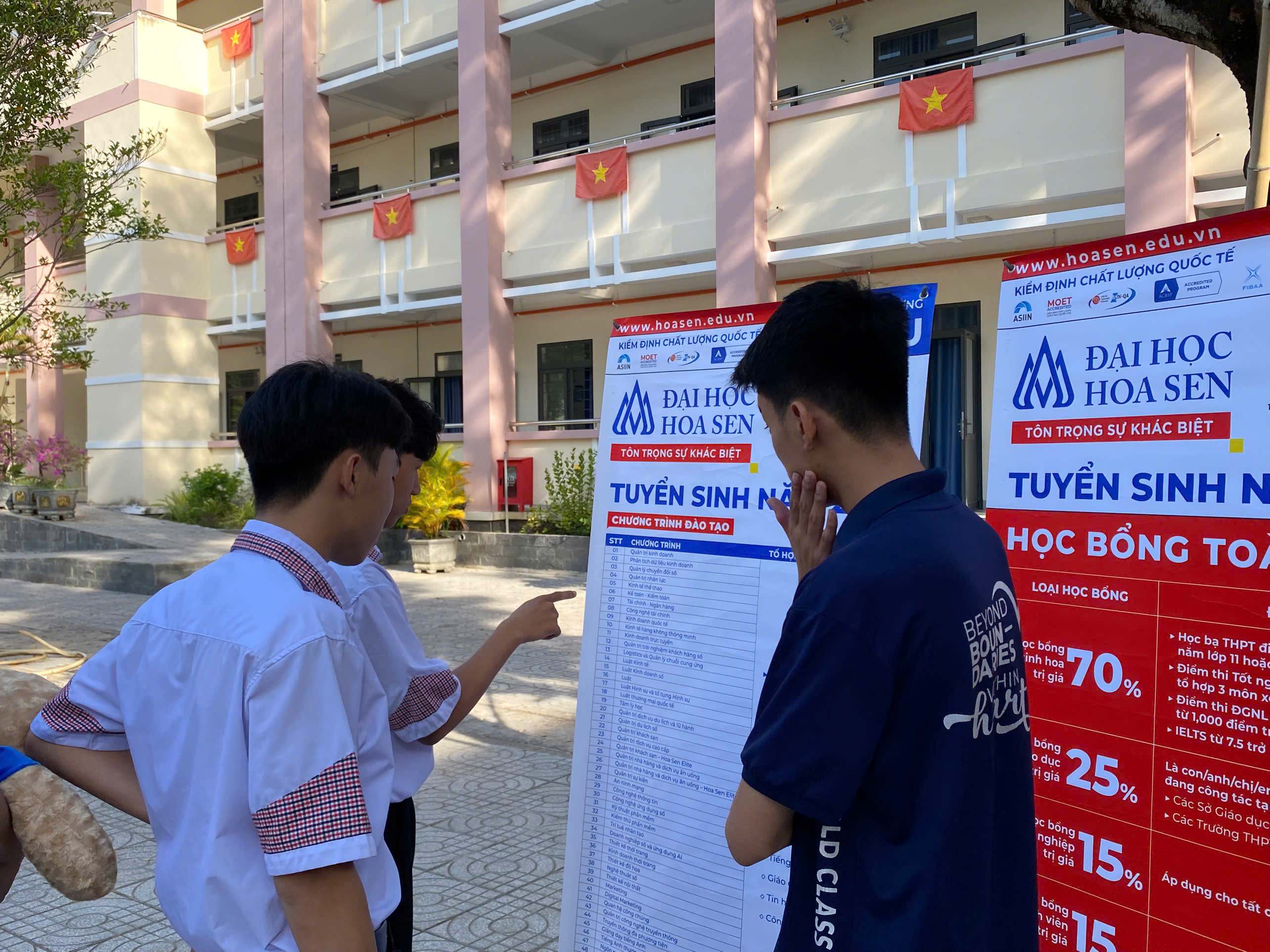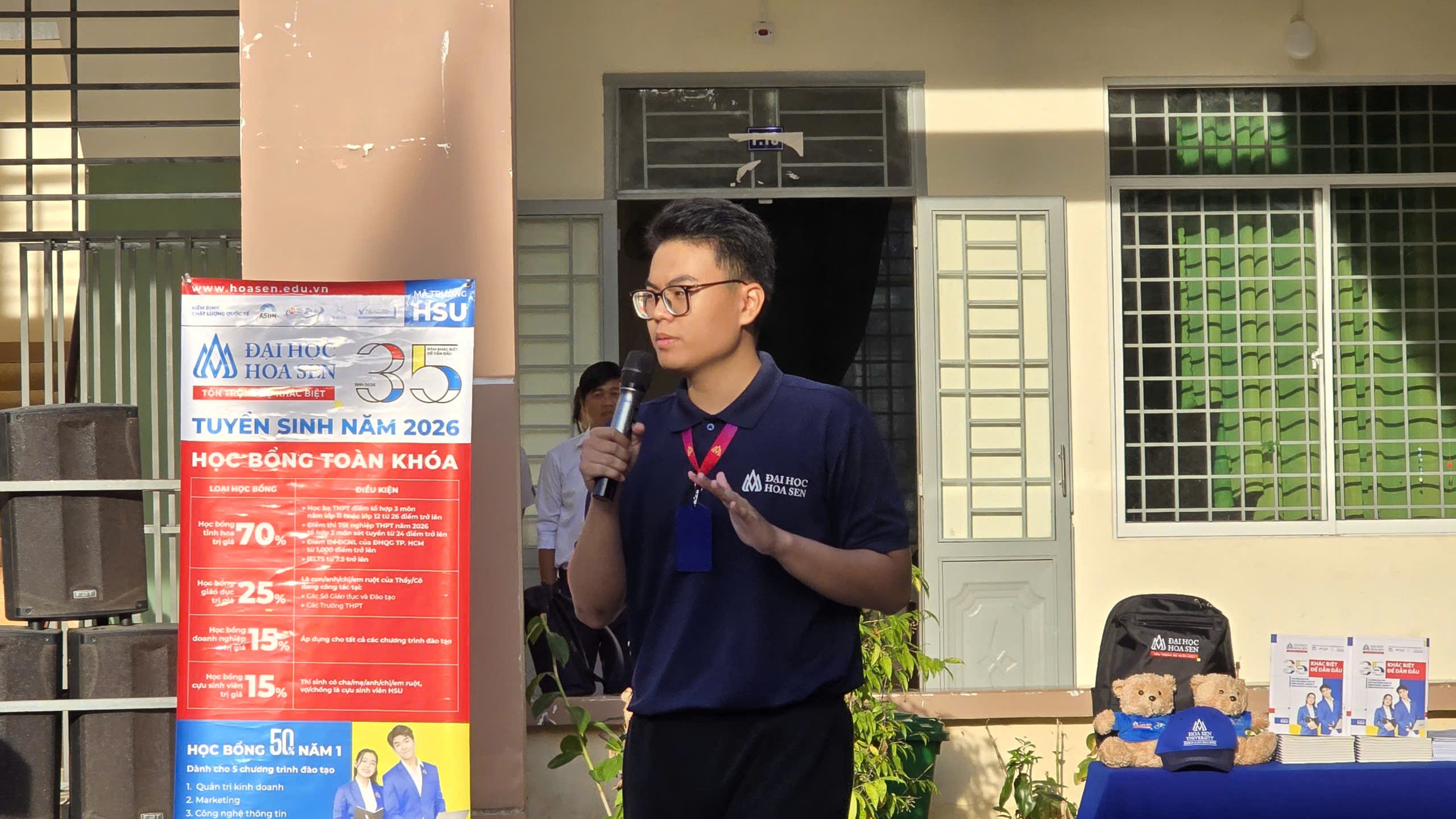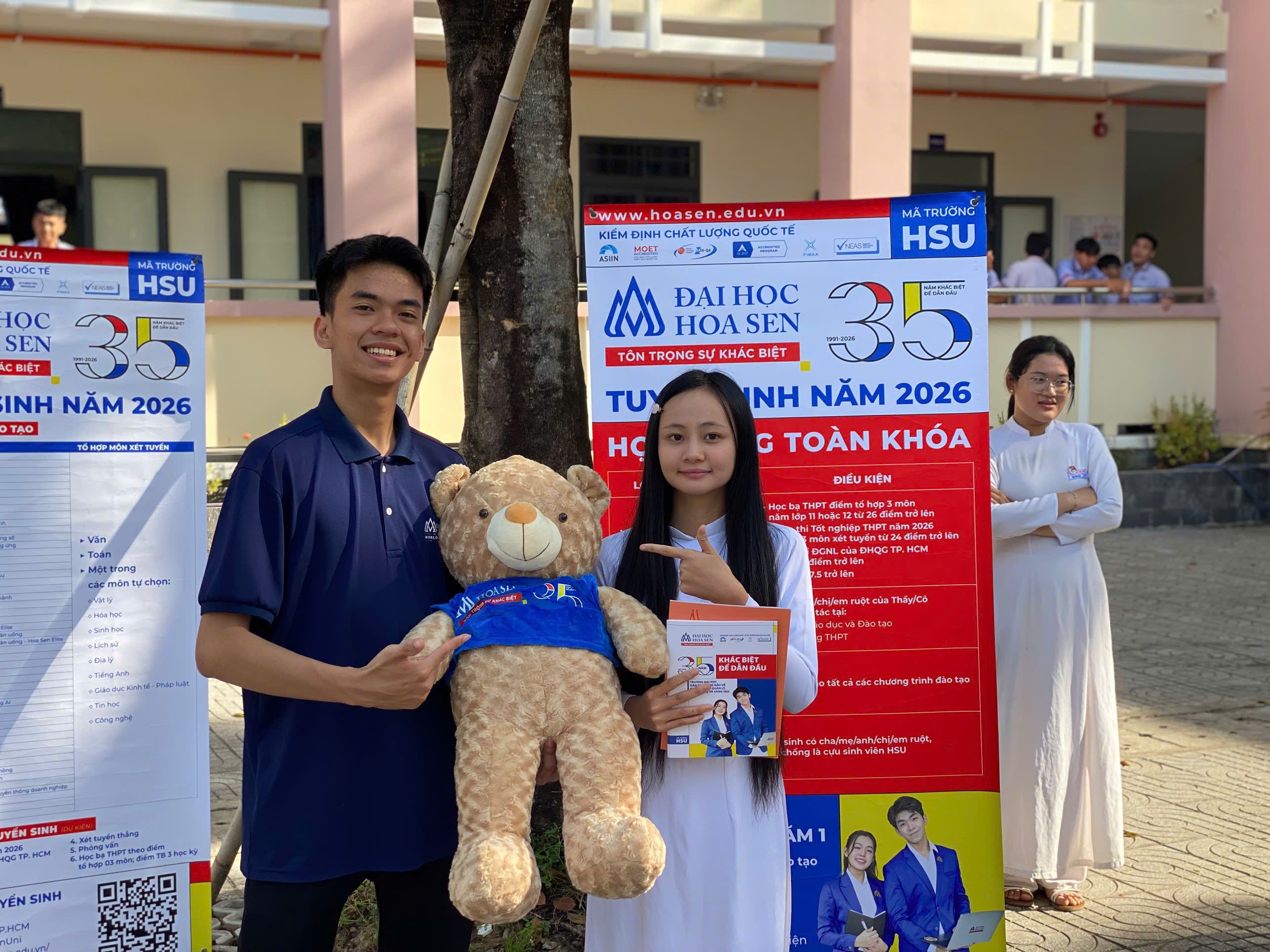 Từ ngày 24 đến 29/12/2025, Trung tâm Tuyển sinh Trường Đại học Hoa Sen (HSU) đã tổ chức chuỗi hoạt động tư vấn hướng nghiệp tại 11 trường THPT trên địa bàn tỉnh An Giang (Kiên Giang cũ). Không gian giờ ra chơi quen thuộc bỗng trở nên sôi nổi hơn khi học sinh được lắng nghe, giao lưu trực tiếp cùng chính những anh chị sinh viên Hoa Sen – những người đang trải nghiệm môi trường đại học bằng sự chủ động, tự tin và bản lĩnh.