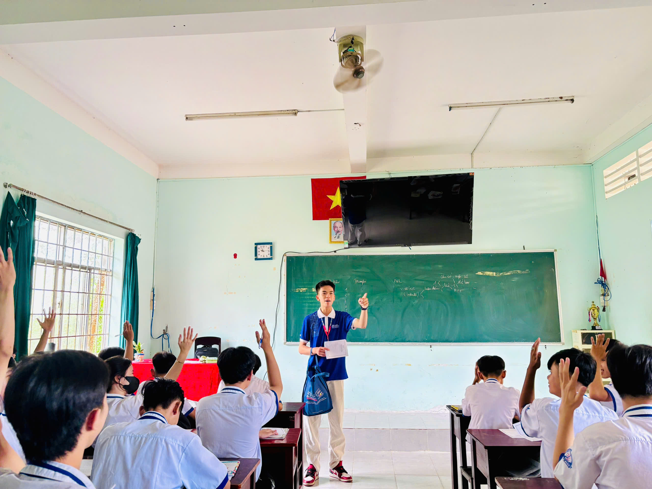 Phần chia sẻ sau đó được bạn Trần Quốc Anh (năm 3, ngành Marketing) chuyển ngữ, giúp học sinh có thể hiểu toàn bộ nội dung cũng như thấy gần gũi hơn với các bạn sinh viên. Cách truyền đạt này giúp các bạn Gen Z tại An Giang vừa tiếp nhận thông tin mà còn cảm thấy được truyền cảm hứng học tập.