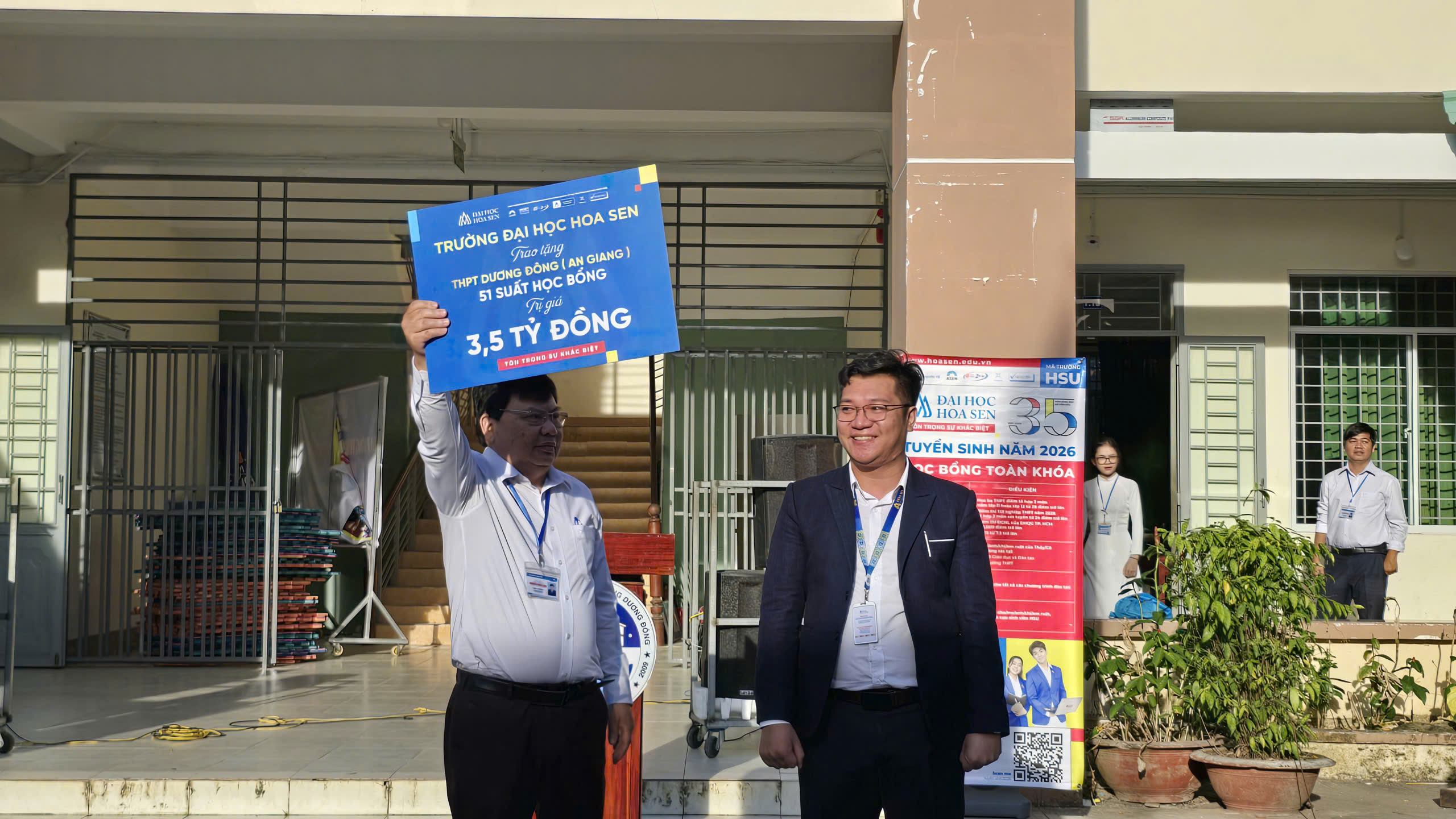 Trong khuôn khổ chương trình tư vấn hướng nghiệp, Đại học Hoa Sen đã trao tặng học bổng tuyển sinh đến Trường THPT Phú Quốc và Trường THPT Dương Đông, như một lời cam kết đồng hành cùng học sinh địa phương trên hành trình chuẩn bị cho tương lai.