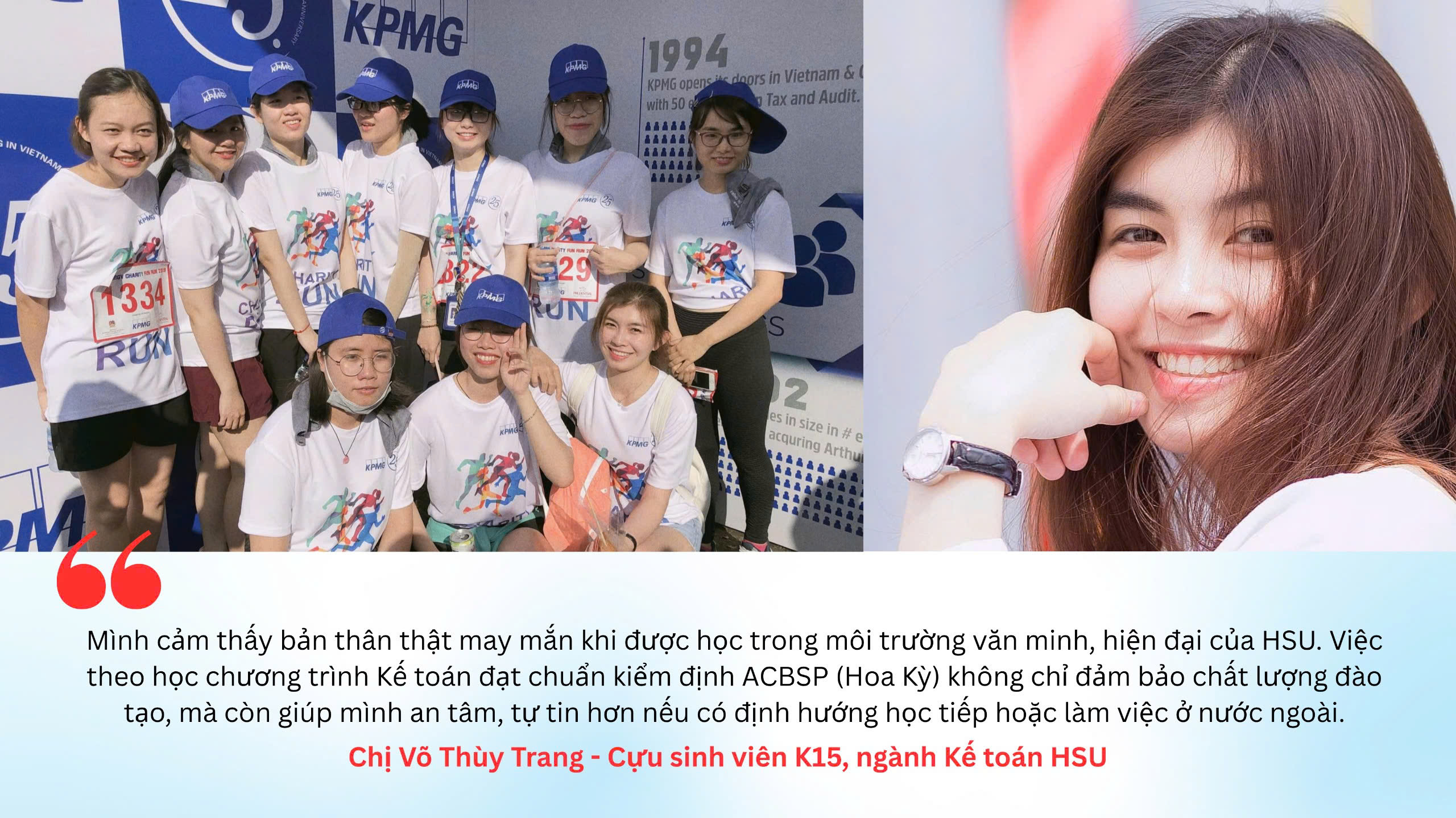 Võ Thuỳ Trang – cựu sinh viên ngành Kế toán, sau khi hoàn thành chương trình học tại HSU trong 3,5 năm, đã nhanh chóng trúng tuyển vào KPMG Việt Nam – một trong bốn công ty kiểm toán hàng đầu thế giới (Big4). Sau này, Thùy Trang tiếp tục phát triển tại Suntory Pepsico Vietnam Beverage với vai trò Financial Planning Manager – Non Traditional Trade.