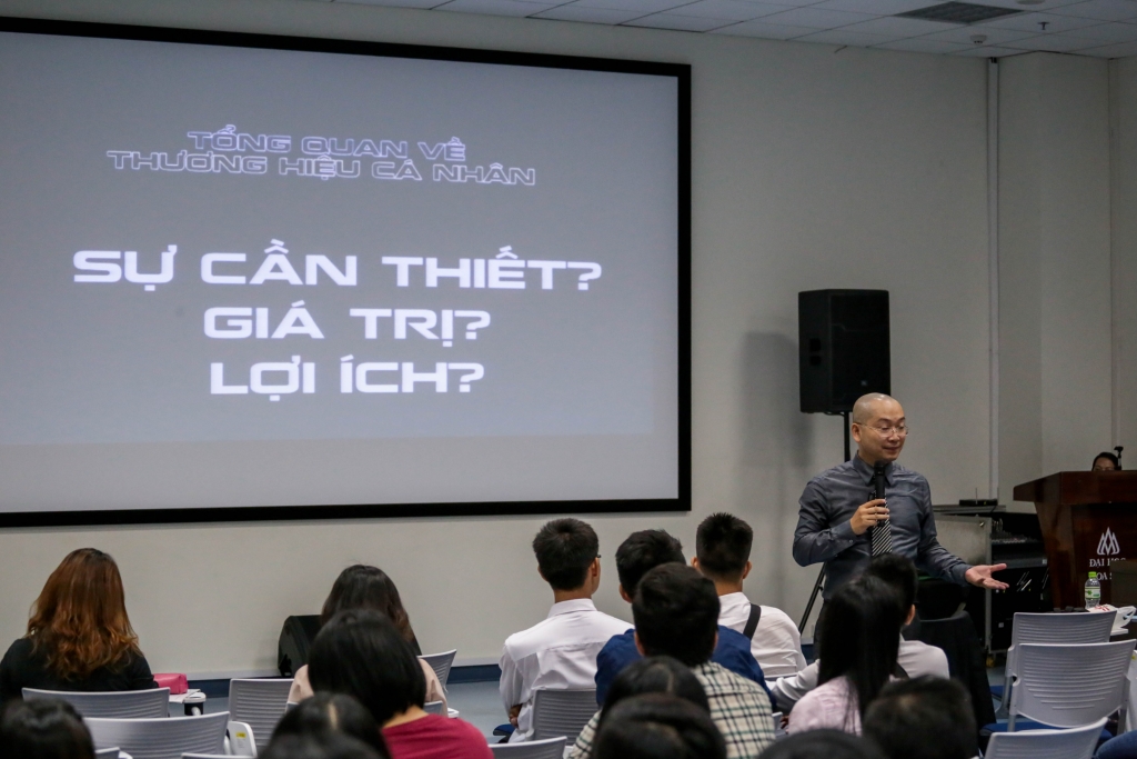 Diễn giả Diệp Minh Nghị giới thiệu với sinh viên Hoa Sen về kỹ năng xây dựng thương hiệu cá nhân – Ảnh: V. Thôn