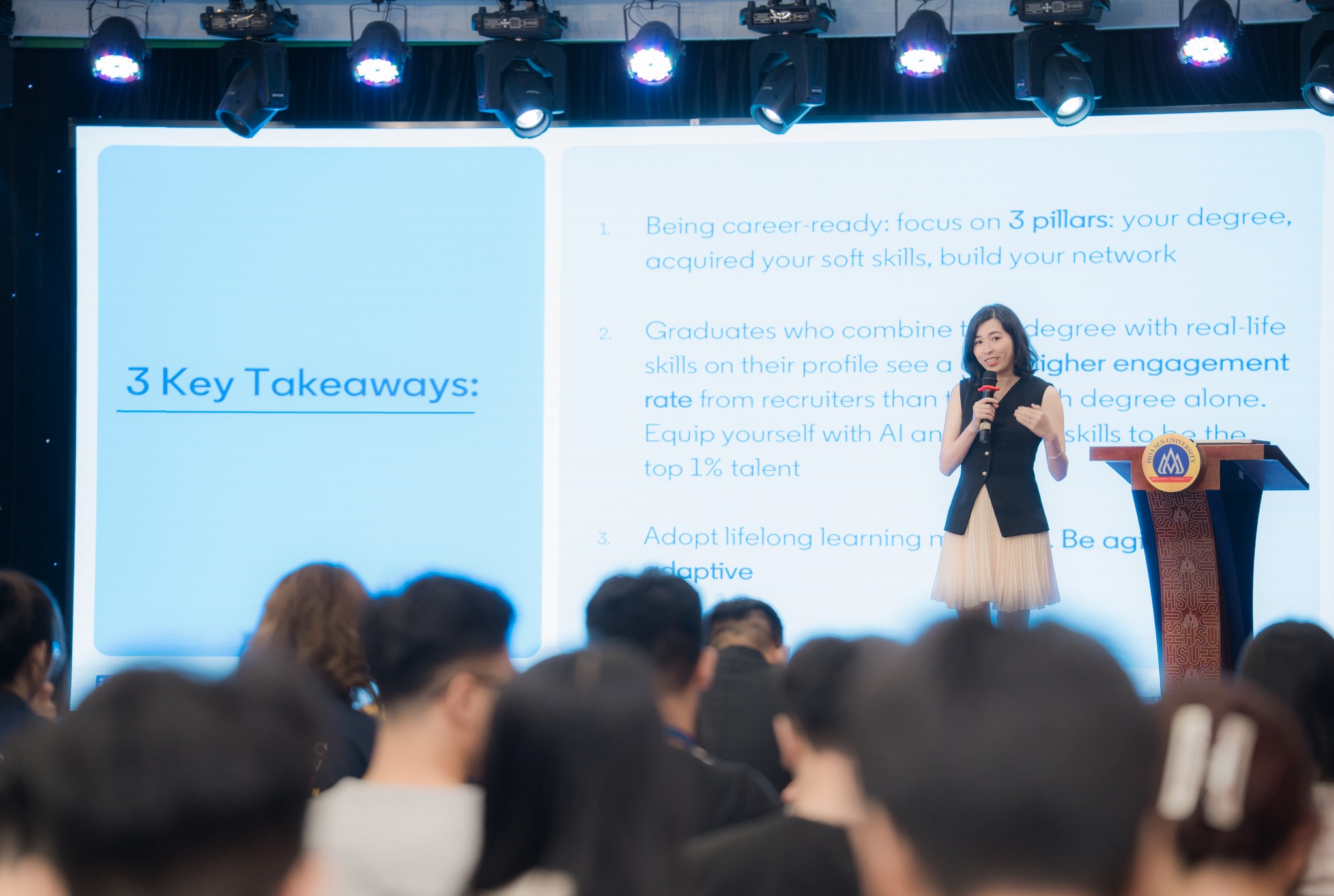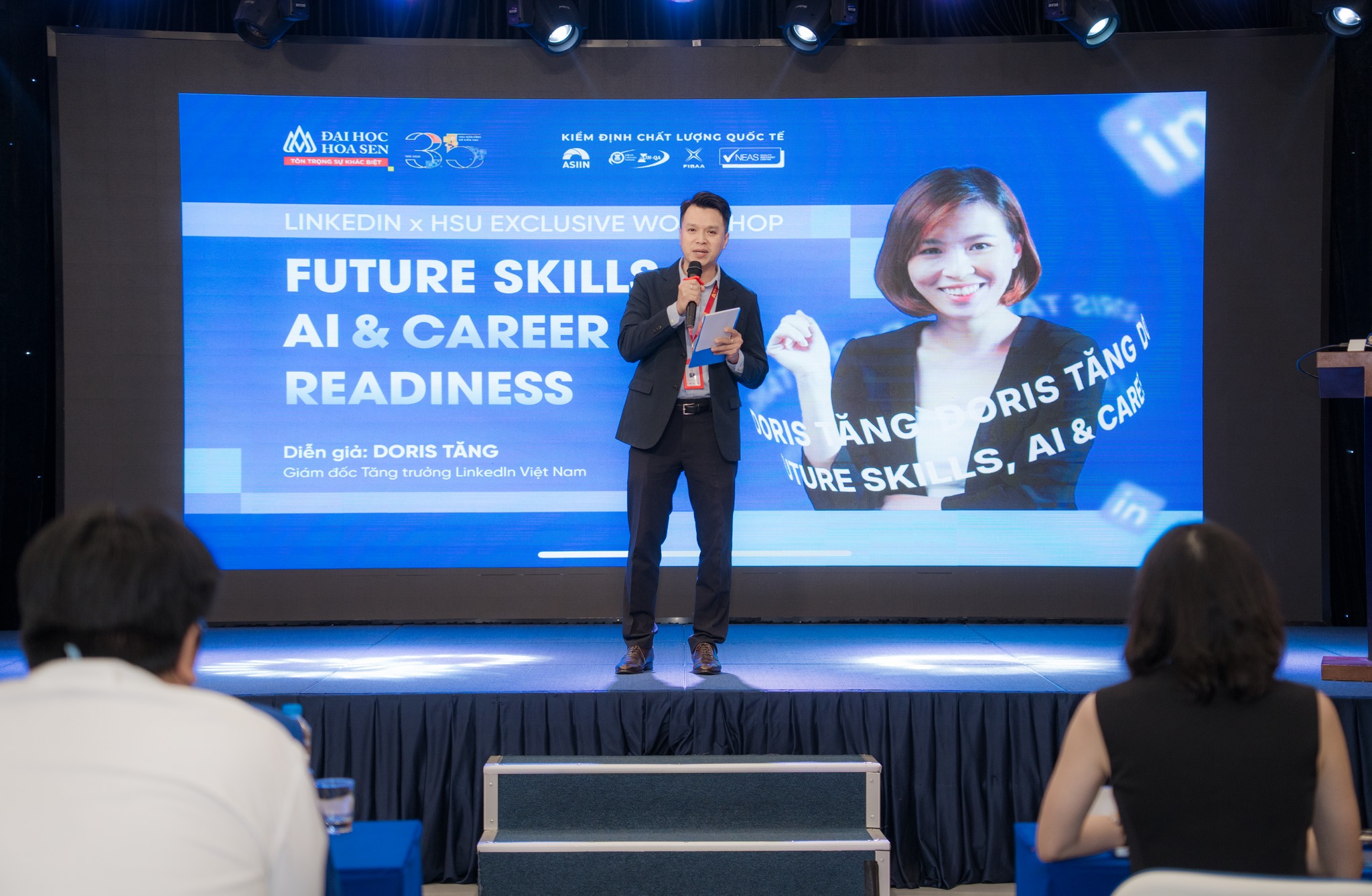 Chiều 23/3/2026, workshop “Future Skills, AI & Career Readiness” tại Trường Đại học Hoa Sen đã mang đến cho sinh viên những góc nhìn cập nhật về thị trường lao động, đồng thời mở ra cách tiếp cận thực tế để chuẩn bị cho hành trình nghề nghiệp trong bối cảnh mới. Với sự đồng hành của bà Doris Tăng – Giám đốc Tăng trưởng LinkedIn Việt Nam, chương trình thu hút đông đảo sinh viên HSU quan tâm và tham dự.