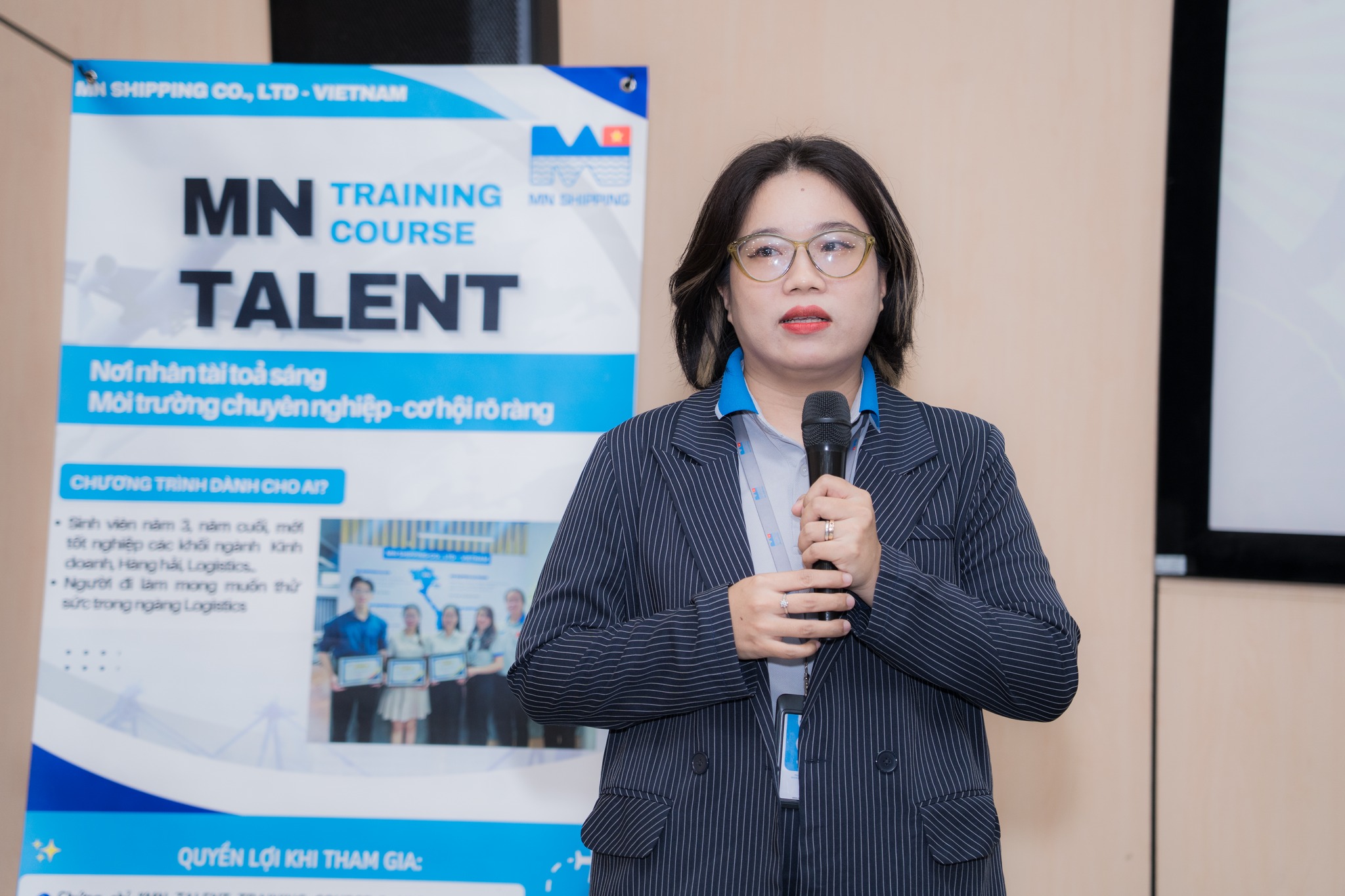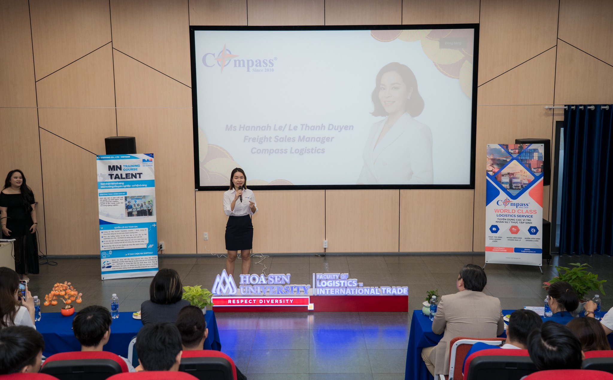 Trong khuôn khổ sự kiện, sinh viên có dịp giao lưu và gặp gỡ đại diện hai doanh nghiệp hoạt động trong lĩnh vực logistics là Compass Logistics và MN Shipping. Qua những chia sẻ cởi mở, doanh nghiệp mang đến bức tranh thực tế về ngành, môi trường làm việc, cũng như các cơ hội thực tập và định hướng nghề nghiệp dành cho sinh viên HSU.