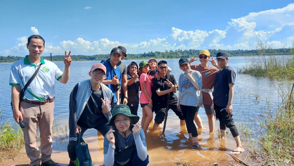 Sinh viên HSU chụp hình check-in trong chuyến trải nghiệm khám phá vẻ đẹp hoang sơ rừng Mã Đà.