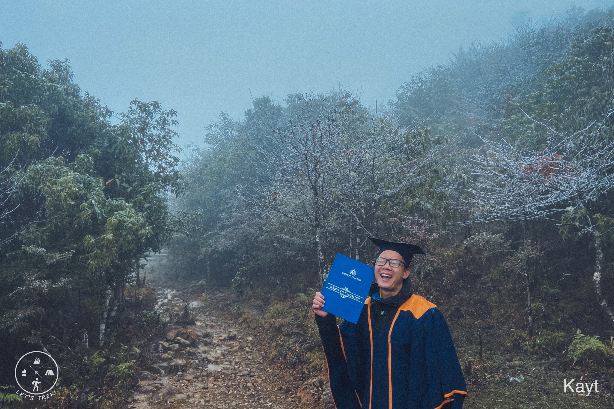 Nguyễn Tuấn Khanh là sinh viên ngành Quản trị Dịch vụ Nhà hàng và Ăn uống của Trường Đại học Hoa Sen. Dù đã hoàn thành chương trình học cách đây hơn 1 năm, song, do tình hình dịch bệnh phức tạp, Lễ tốt nghiệp của Tuấn Khanh phải dời từ năm 2021 sang năm 2022. Để ghi lại dấu ấn cho sự kiện quan trọng này, Khanh đã mang “bộ đồ tốt nghiệp” đi khắp các tỉnh, thành như Sapa, Đà Nẵng, Đà Lạt, Yên Bái, Hà Nội, TP.HCM. Đặc biệt, Tuấn Khanh đã mặc Lễ phục tốt nghiệp chinh phục 2 đỉnh núi lớn là Fansipan- nóc nhà Đông Dương, Sống Lưng Khủng Long và đỉnh Tà Xùa của tỉnh Yên Bái.